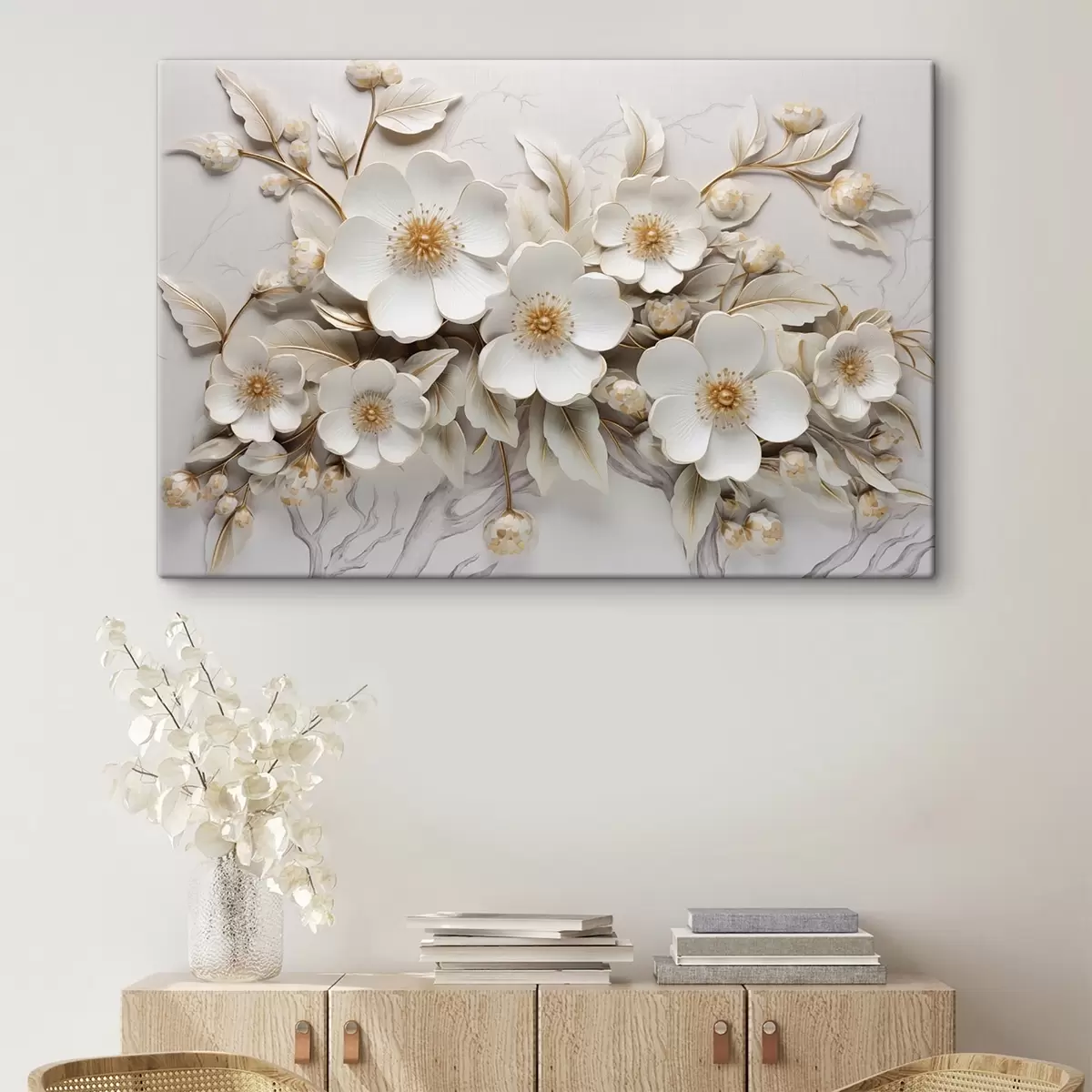 Pictură pe pânză flori albe 3d în stil clasic cu un accent galben Nr s43313