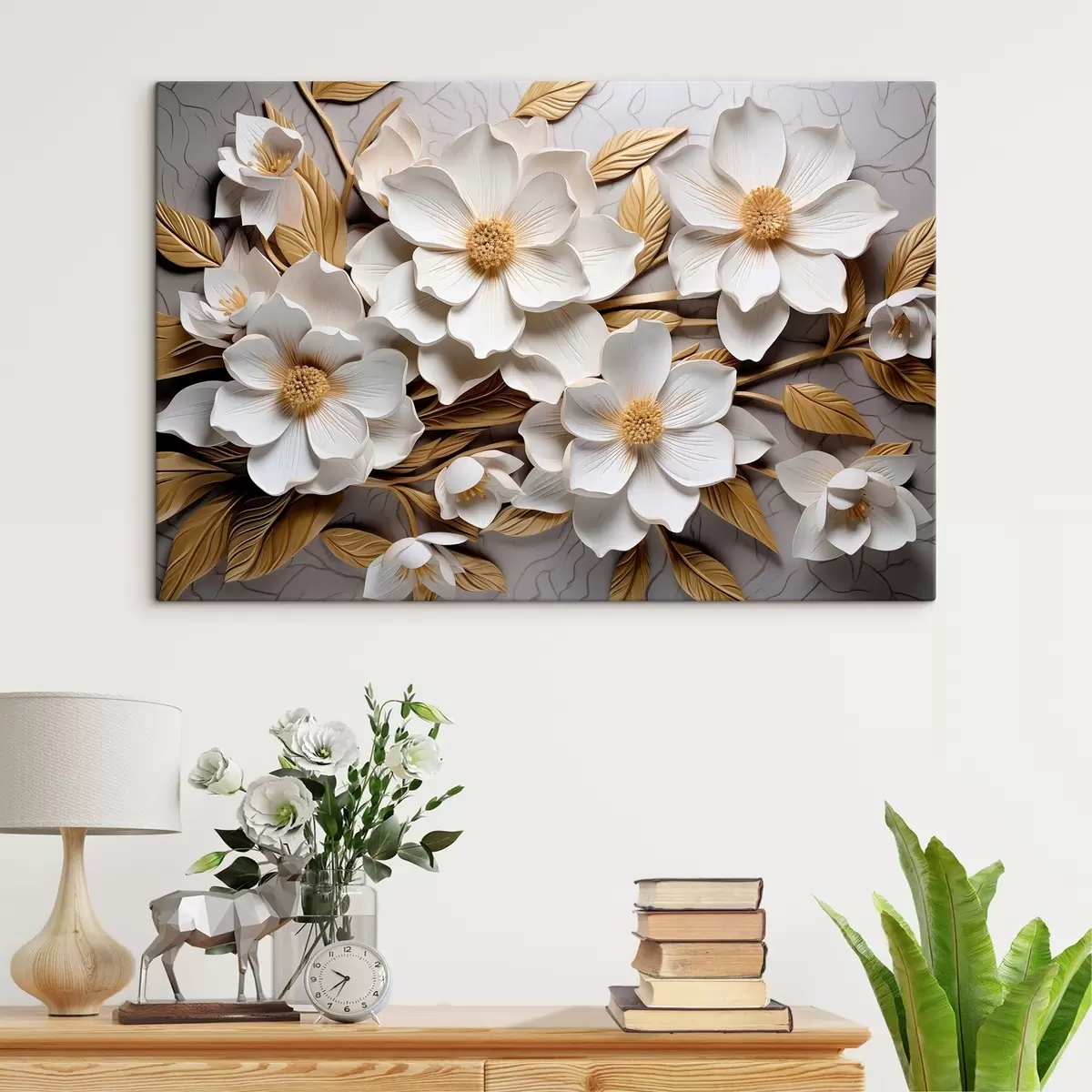 Pictură pe pânză Flori albe în stilul unei fresce în relief, cu frunze și stamine galbene Nr s43330