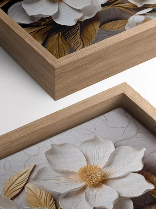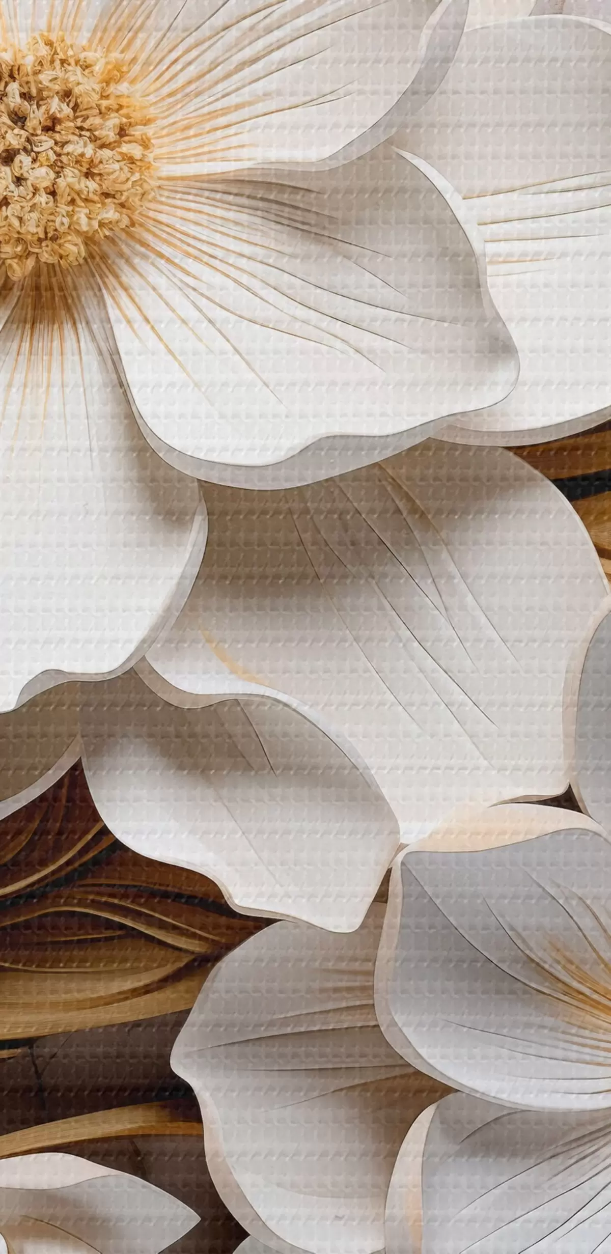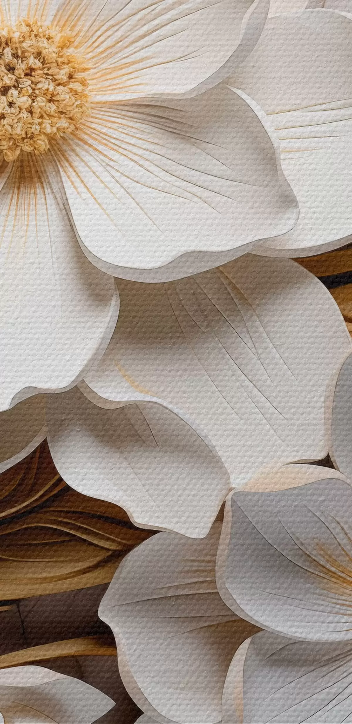 Tablouri Flori albe în stilul unei fresce în relief, cu frunze și stamine galbene s43330