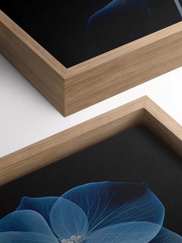 Pictură pe pânză O floare de hortensie albastră translucidă, cu stamine albastre și o tulpină delicată, pe un fundal negru Nr s43395