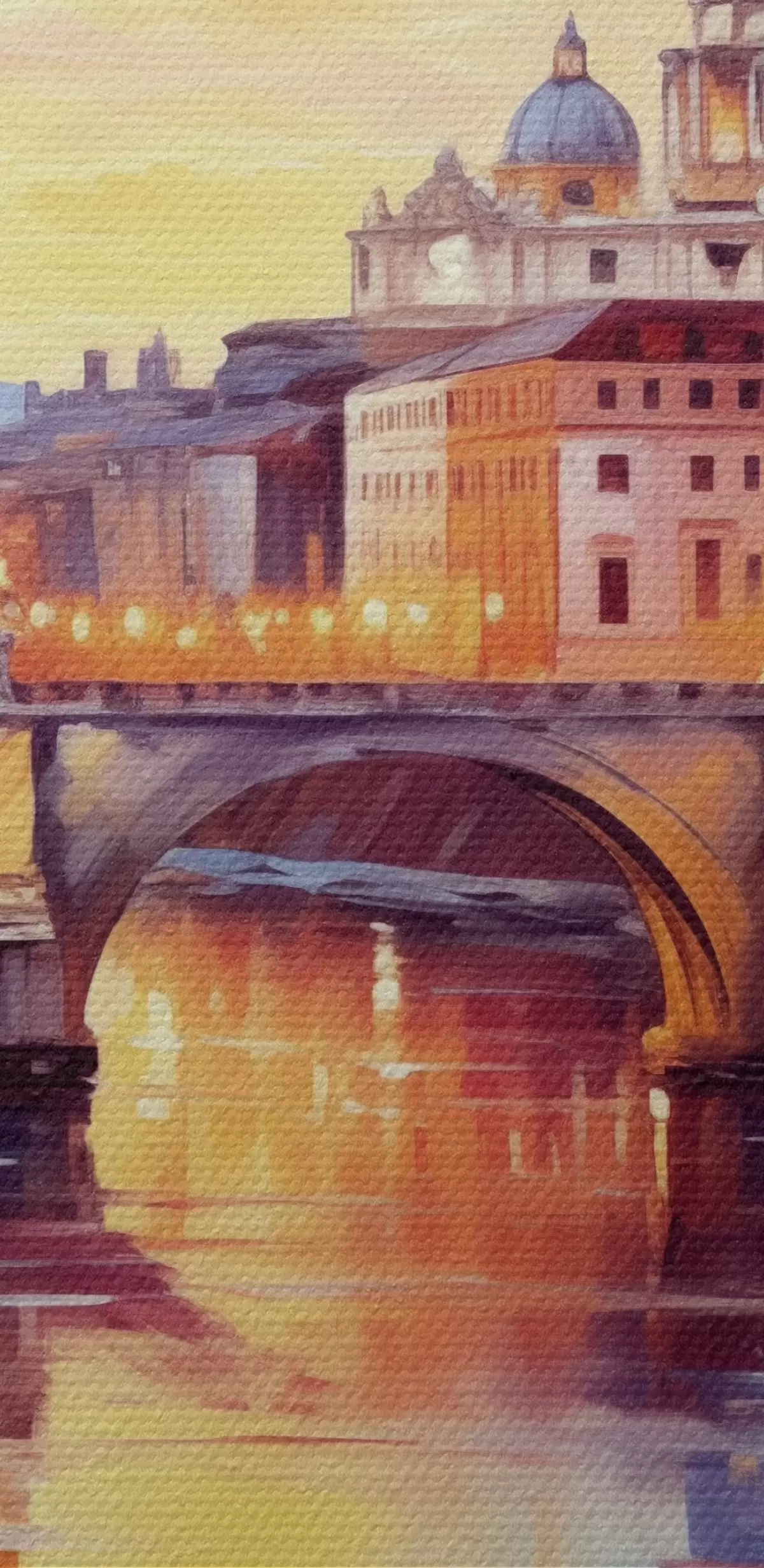 Pictură pe pânză Bazilica Sfântul Petru și podul peste râu la apus de soare, culori calde, reflecție în apă, stil pictură în ulei Nr s43396