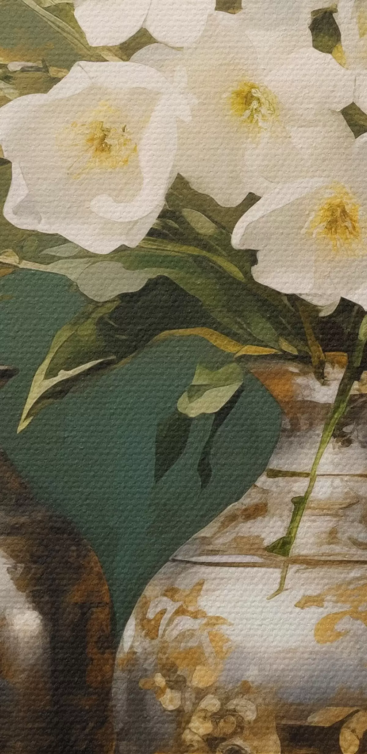 Pictură pe pânză Natură statică de flori albe într-o vază, cu vaze decorative și un castron pe o masă verde, fundal verde închis Nr s43408
