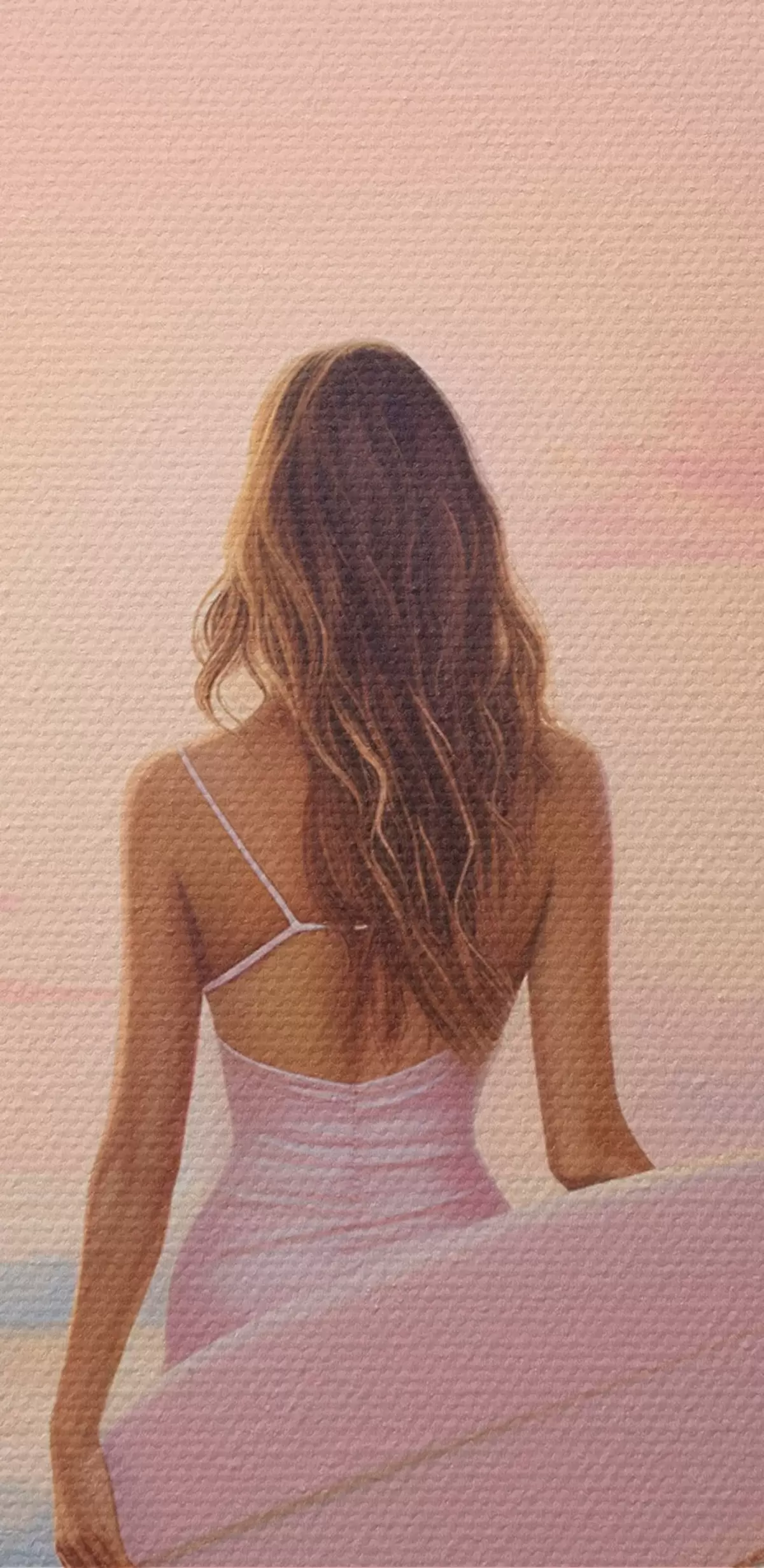 Tablouri Fată cu placă de surf pe plaja oceanului, apus de soare, desen în stil acrilic s43881