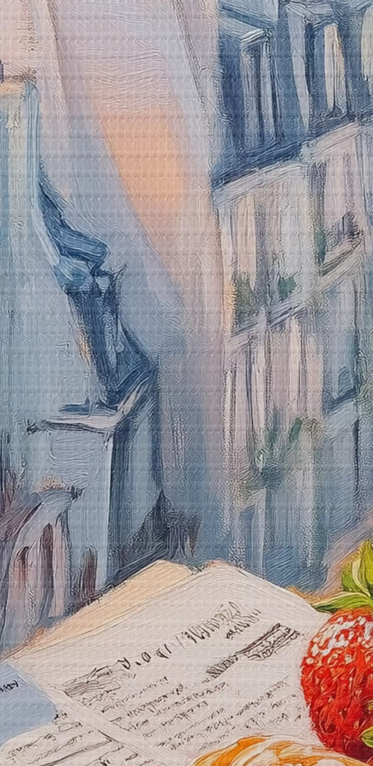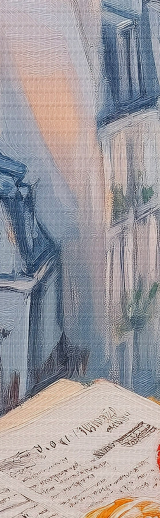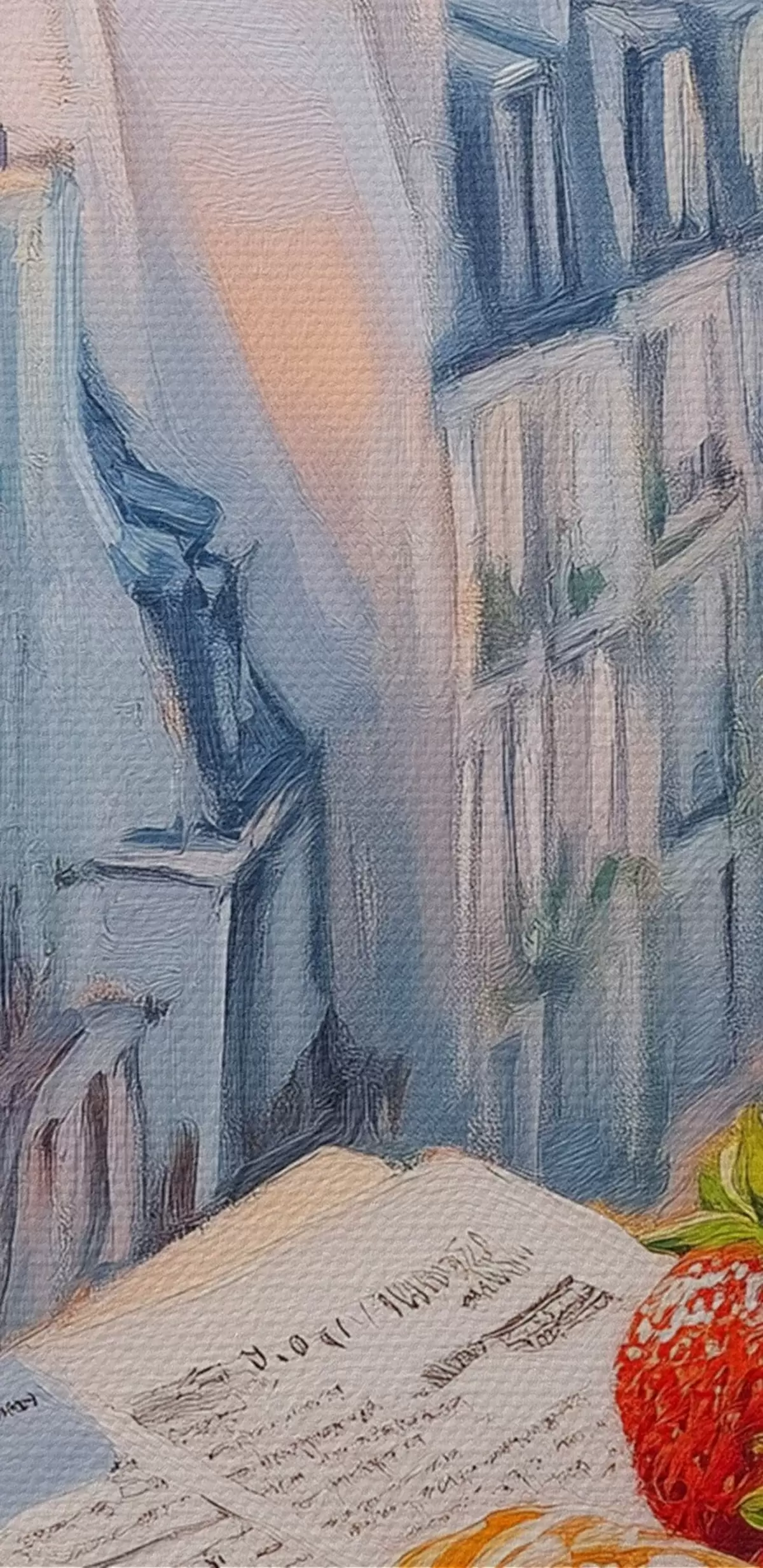 Pictură pe pânză Răsărit de soare pe balcon în Paris, Turnul Eiffel, căpșuni, cafea, jurnal Nr s43890