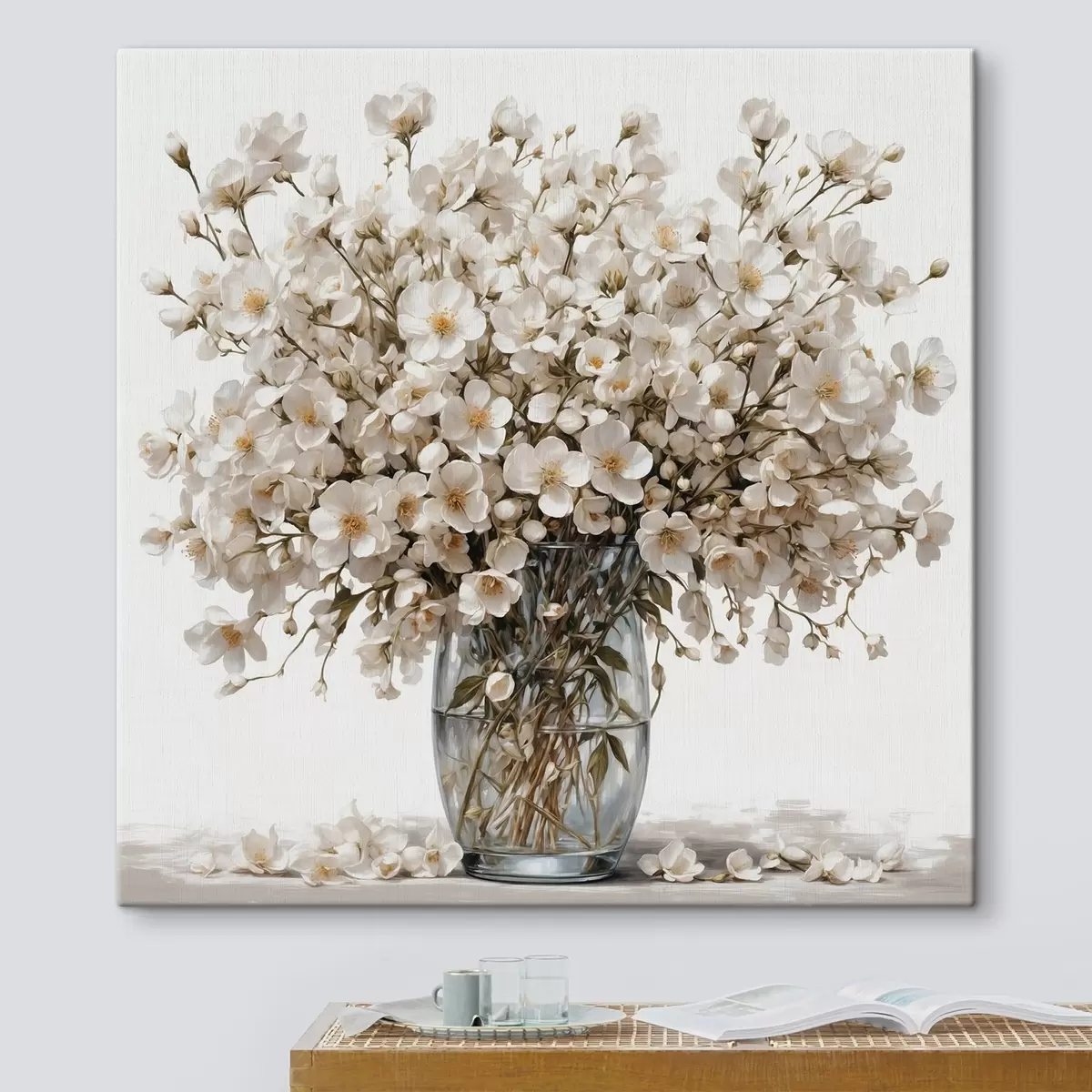 Pictură pe pânză Flori albe în vază transparentă Nr s44092