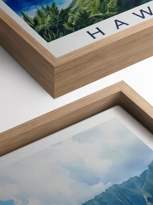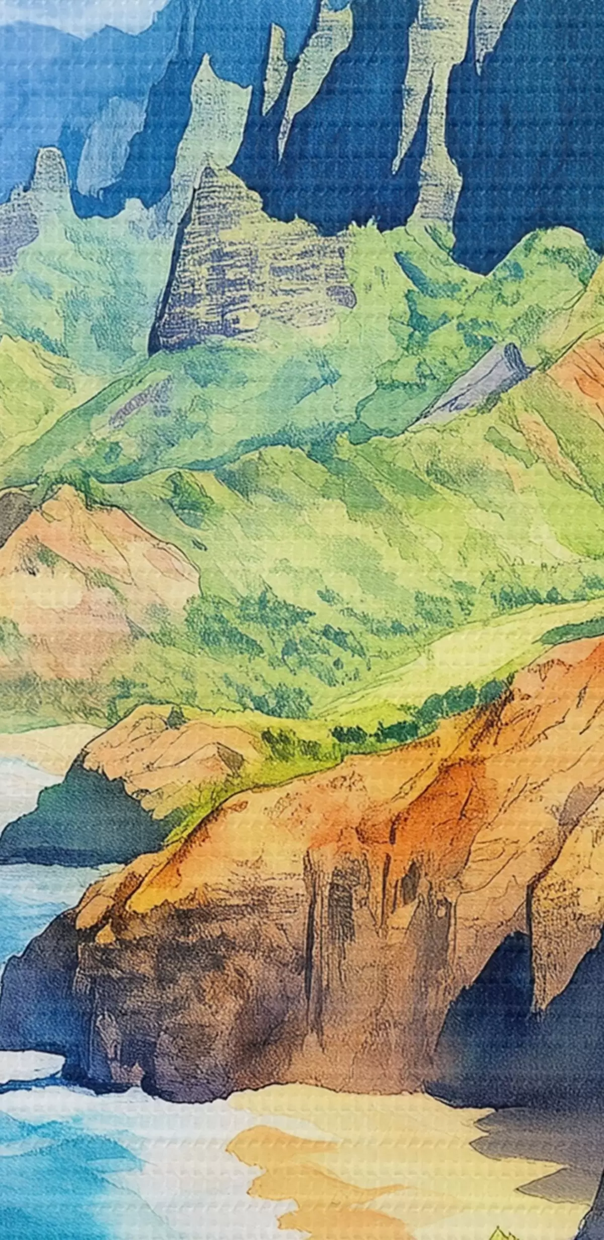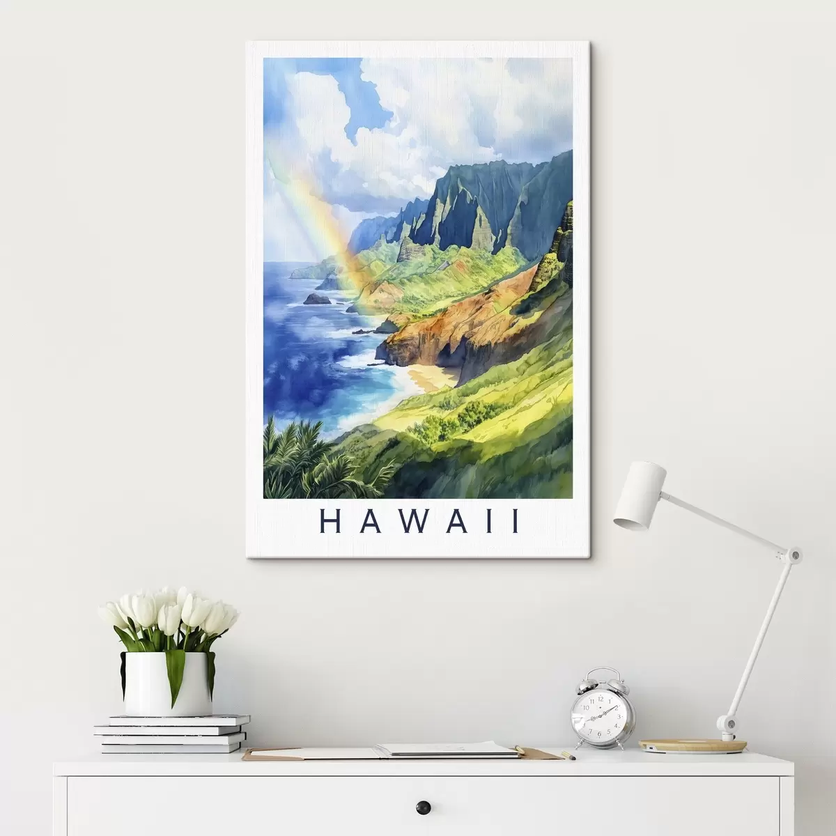 Pictură pe pânză Insula Hawaii, stil acuarelă, curcubeu, munți verzi, ocean Nr s44141