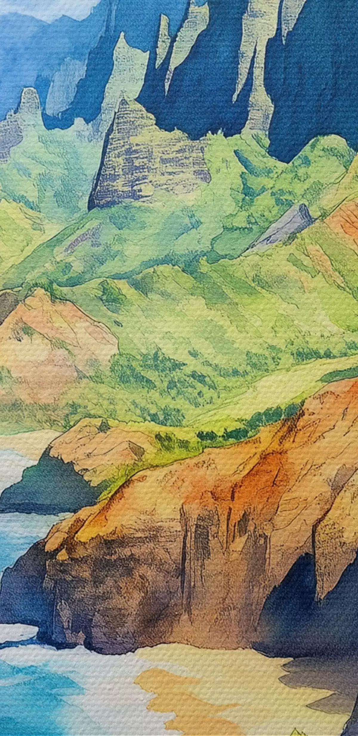 Tablouri Insula Hawaii, stil acuarelă, curcubeu, munți verzi, ocean s44141