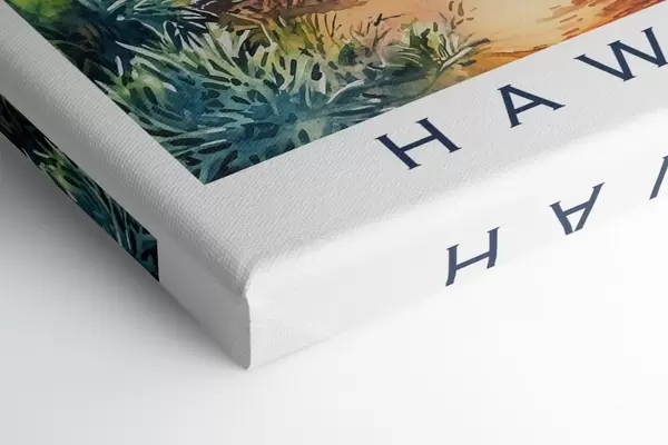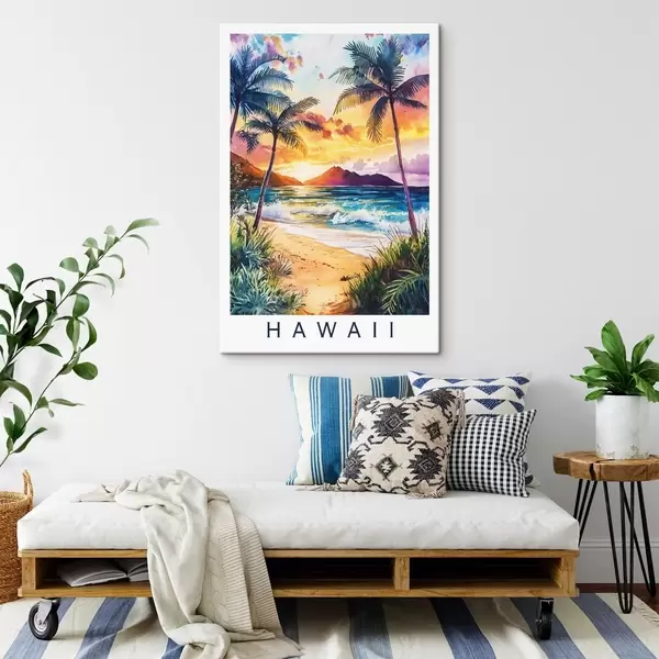 Pictură pe pânză Apus de soare pe insula Hawaii, palmieri, ocean, cer colorat, stil acuarelă Nr s44142