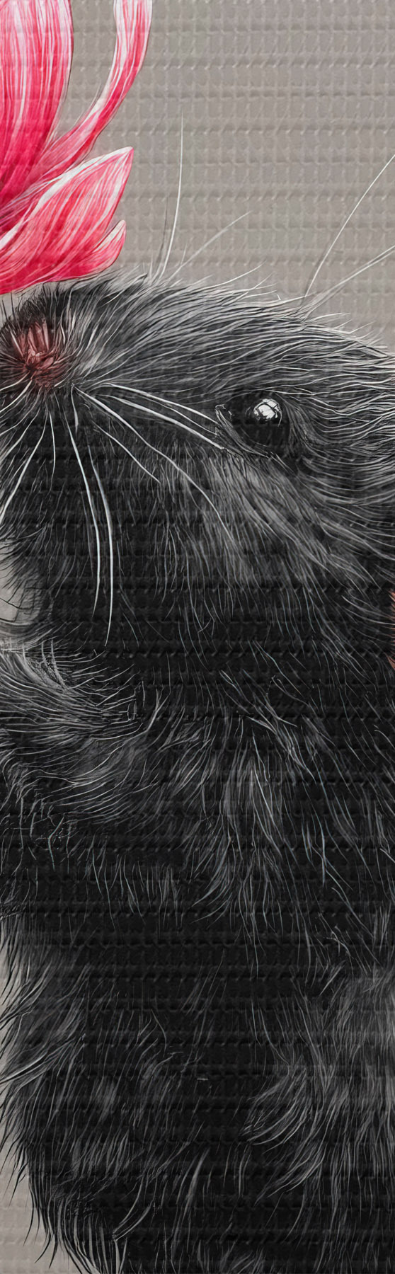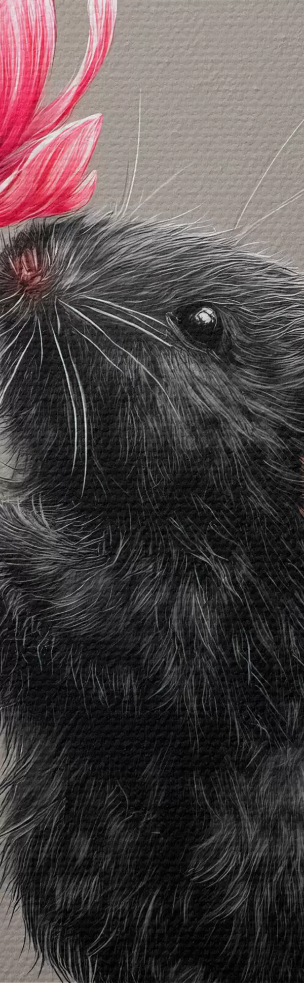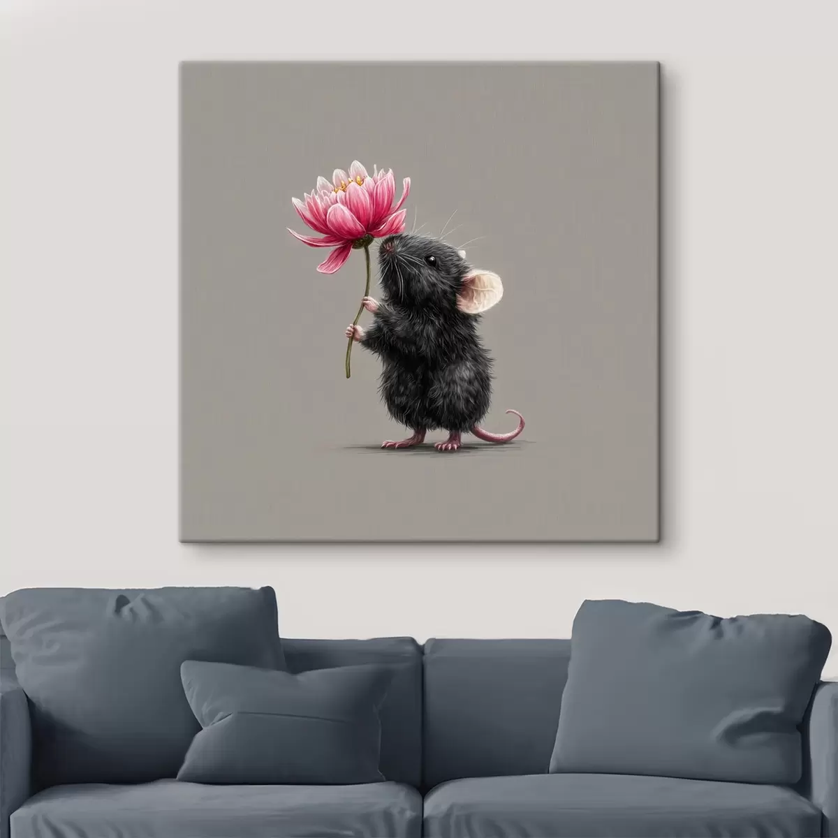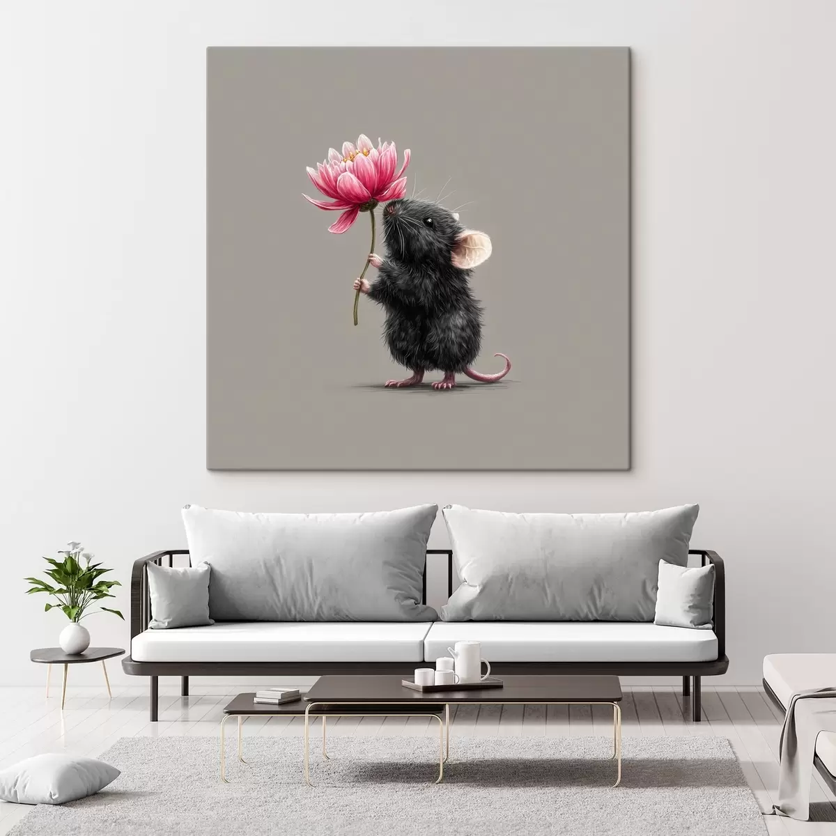 Pictură pe pânză Șoarece fermecător inhalând aroma unei bujori roz Nr s44248