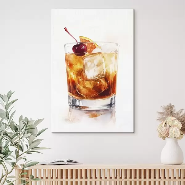 Pictură pe pânză Cocktail portocaliu cu gheață și cireșe, stil acuarelă Nr s44303