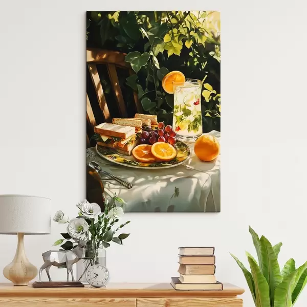 Pictură pe pânză Picnic estetic în grădina de vară, sandvișuri, portocale, limonadă Nr s44306
