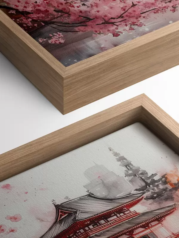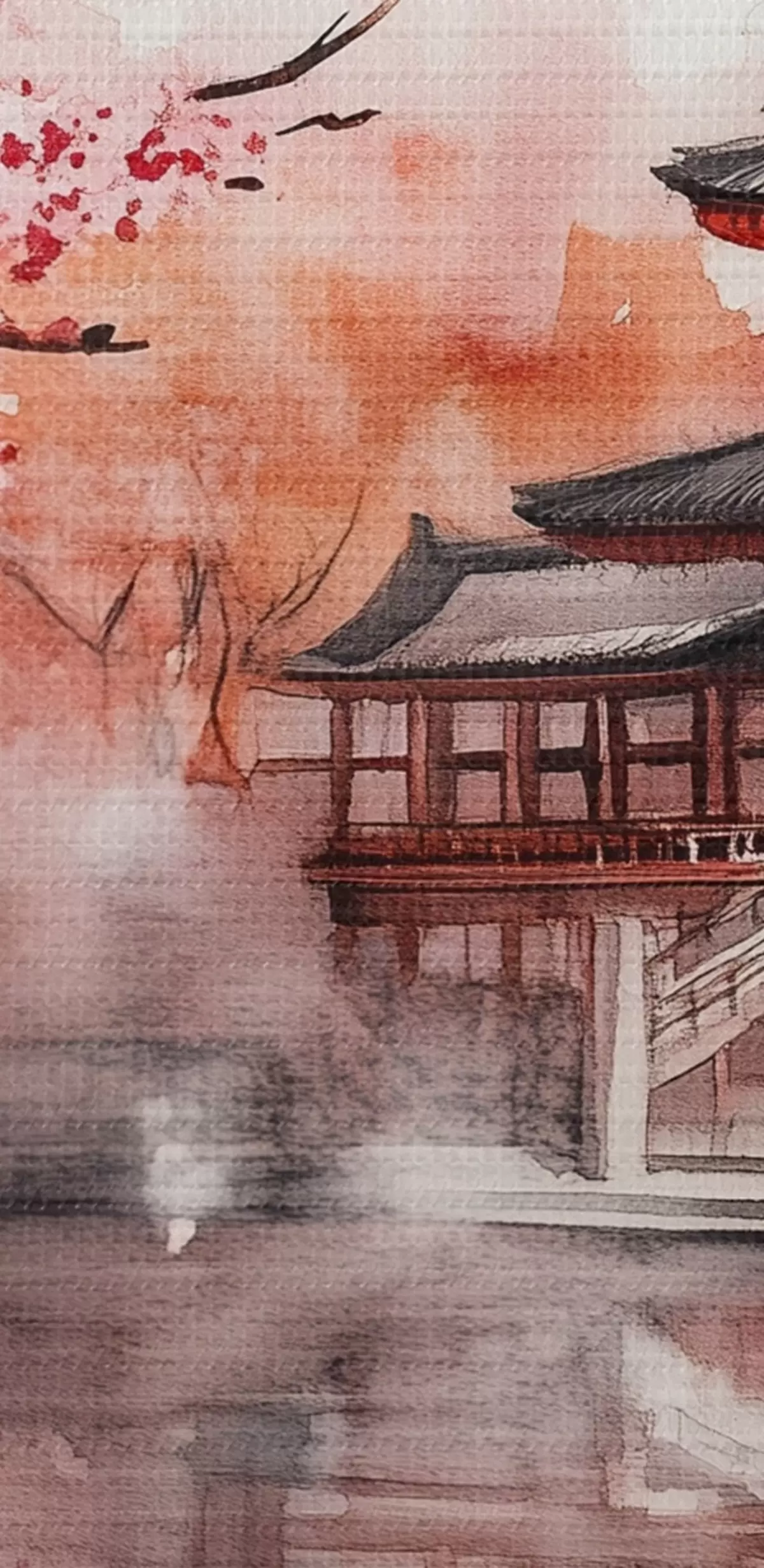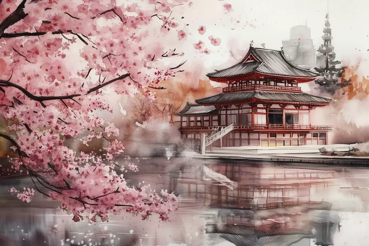 Pictură pe pânză Frumos peisaj japonez cu cireș înflorit și casă pe lac Nr s44310