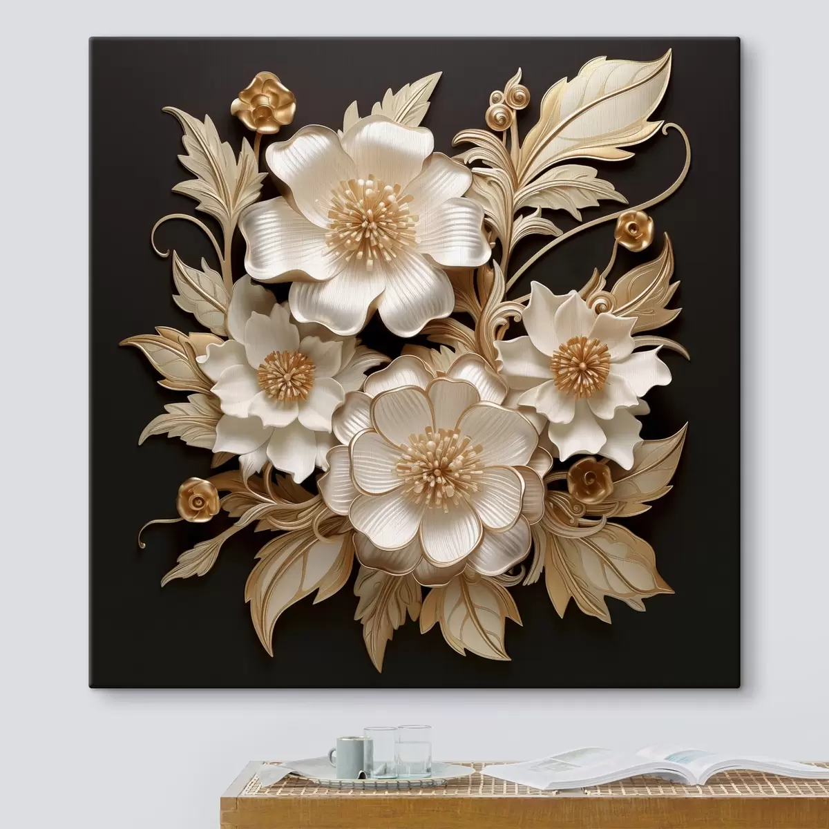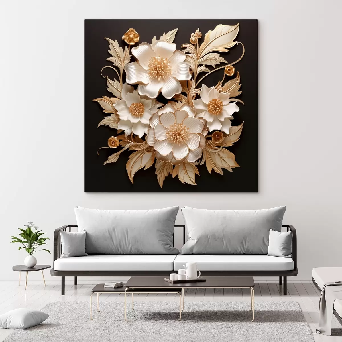 Tablouri Flori albe voluminoase pe un fundal negru s44340