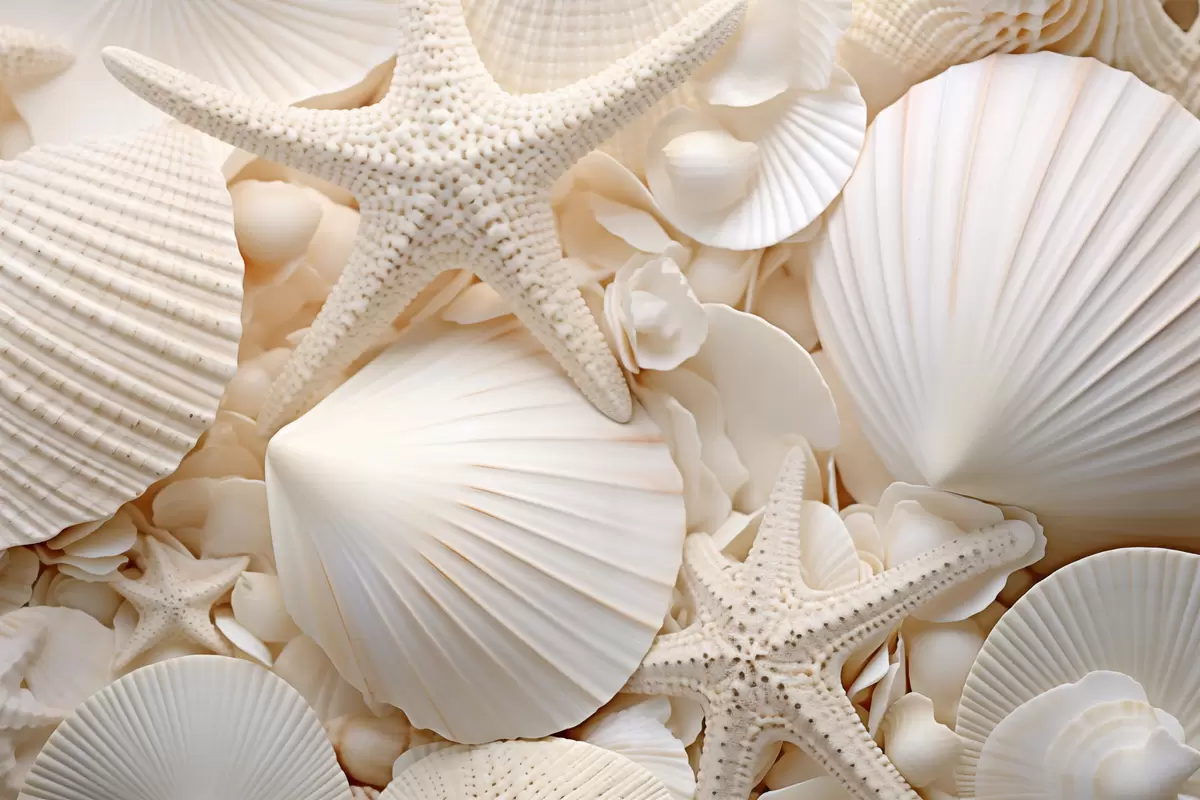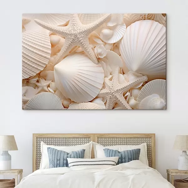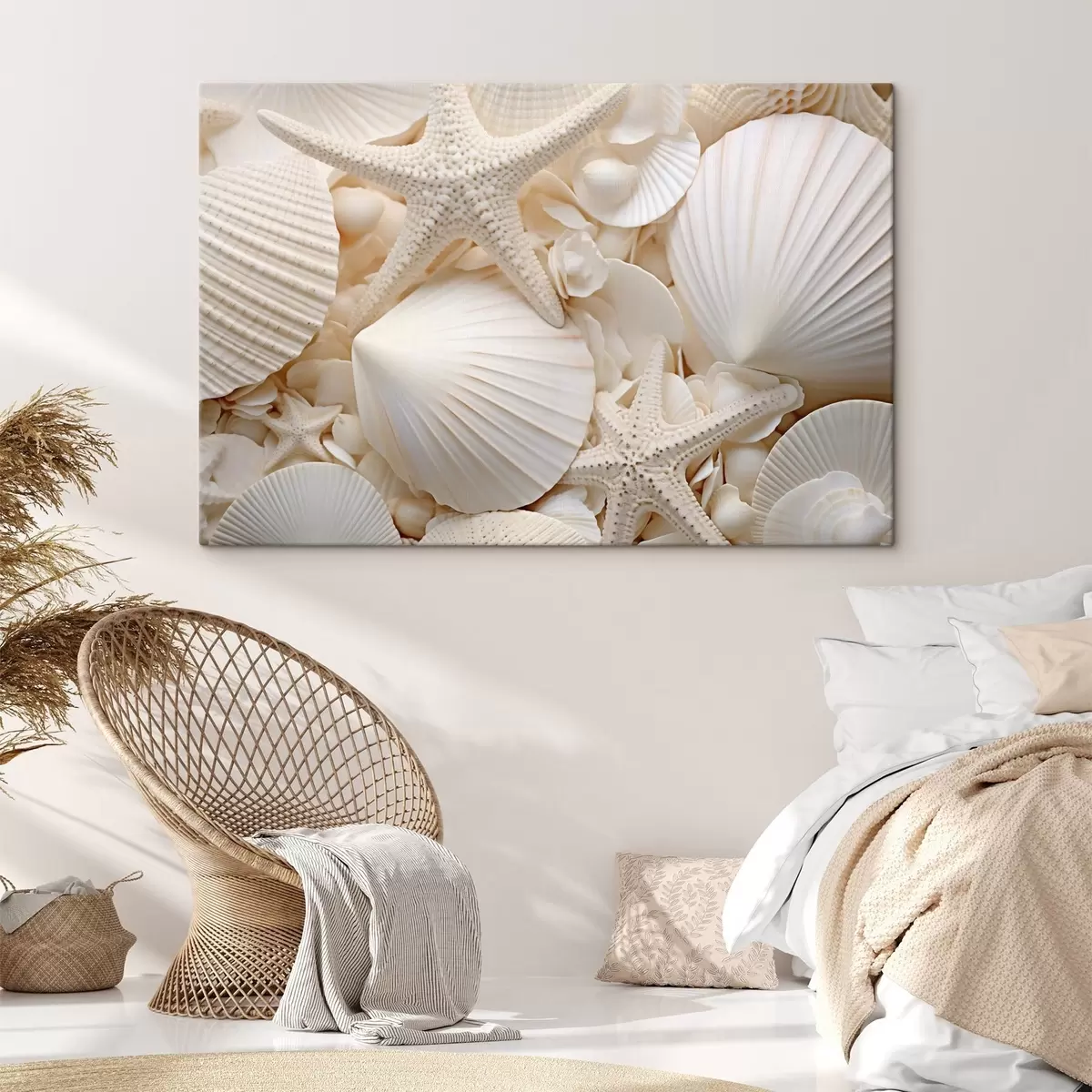 Pictură pe pânză Scoici albe decorative și stele de mare, creând o compoziție monocromatică texturată Nr s44392