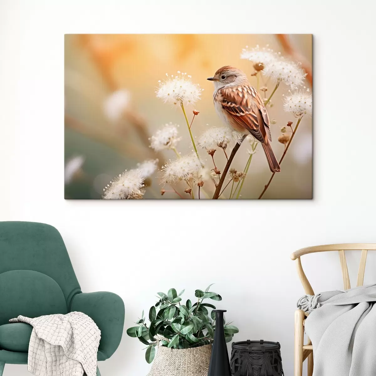 Pictură pe pânză O pasăre cocoțată pe o ramură cu flori albe, focalizare moale, fundal natural Nr s44393