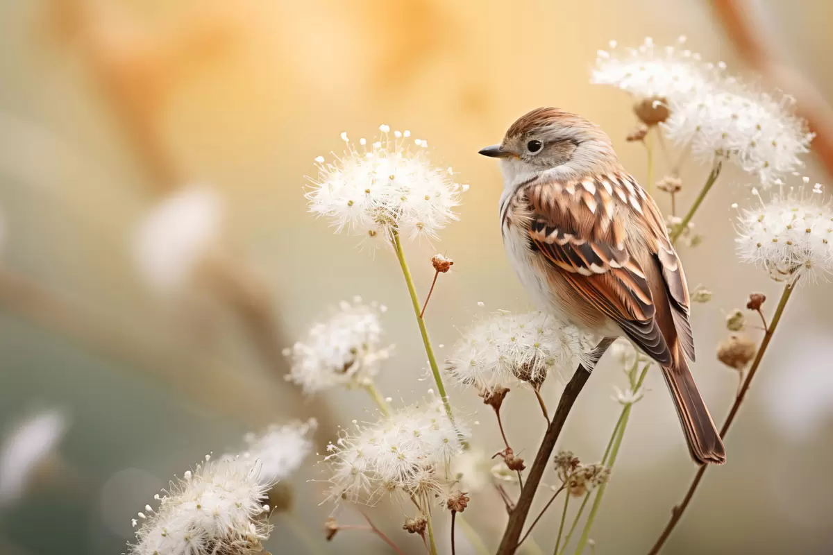Tablouri O pasăre cocoțată pe o ramură cu flori albe, focalizare moale, fundal natural s44393