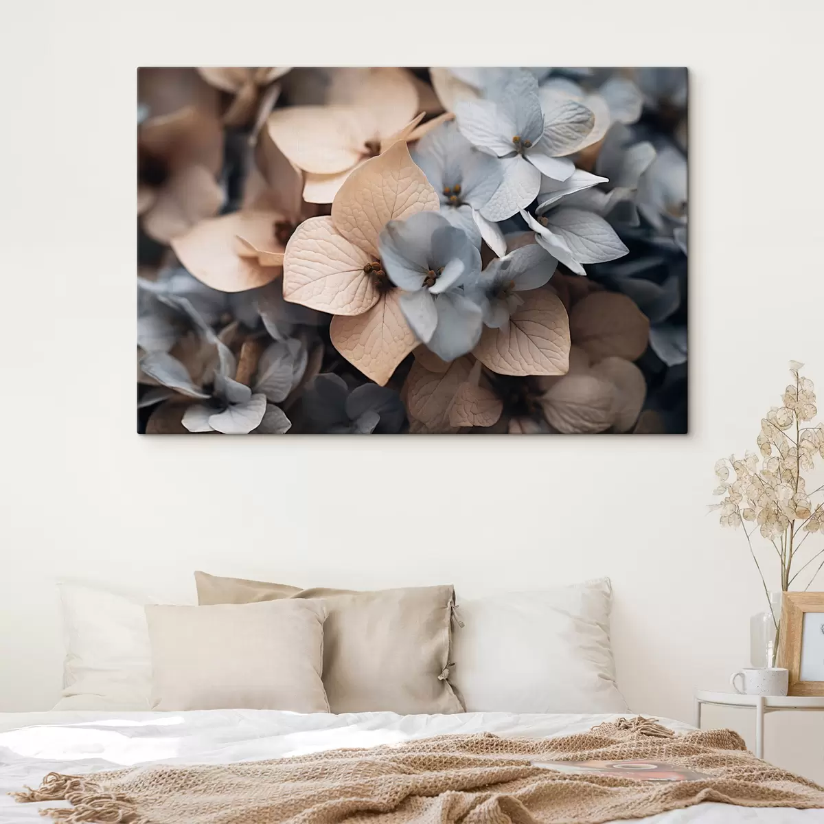 Tablouri Flori de hortensie, petale albastru deschis și bej, cu texturi detaliate, aranjament floral elegant s44394