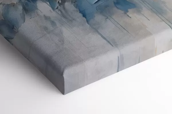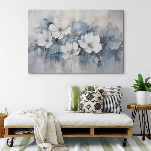 Pictură pe pânză Flori albe cu frunze albastre, pe un fundal bej deschis, cu tușe vizibile Nr s44395