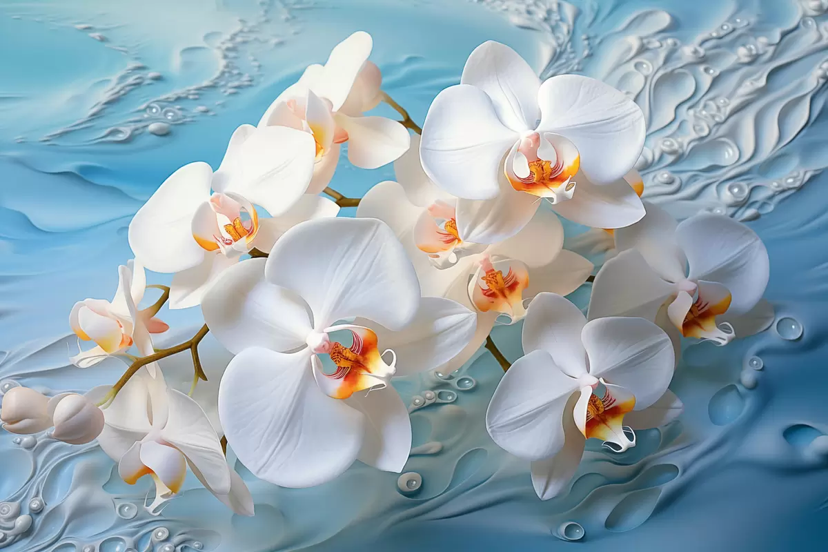 Tablouri Orhidee albe, aranjate pe o suprafață albastru deschis cu picături de apă, iluminare moale s44401