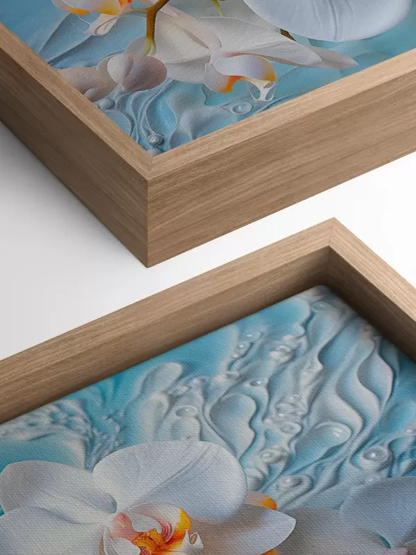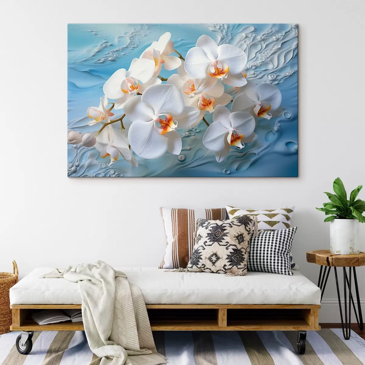 Pictură pe pânză Orhidee albe, aranjate pe o suprafață albastru deschis cu picături de apă, iluminare moale Nr s44401