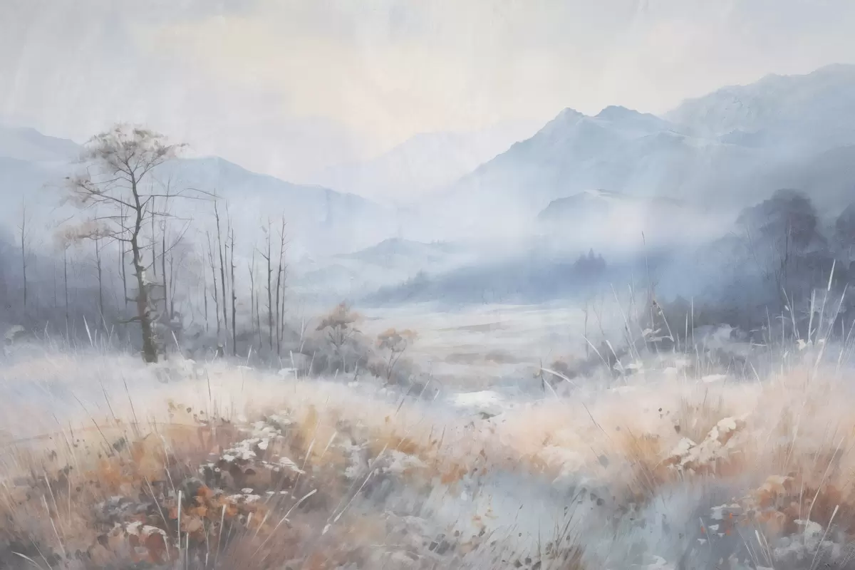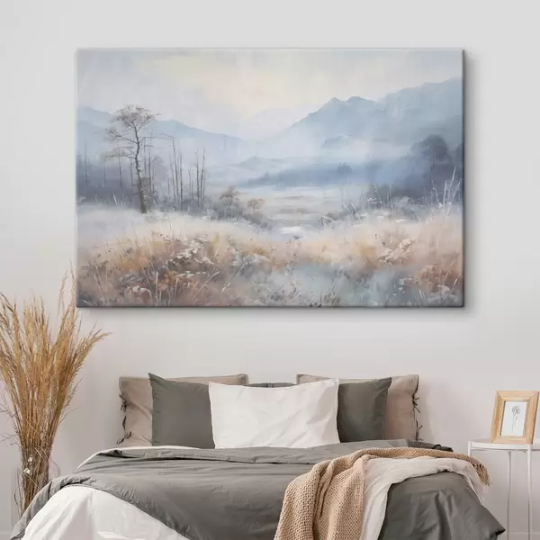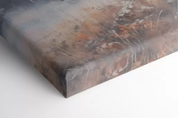 Pictură pe pânză Peisaj texturat cu munți, iarbă uscată și o pădure, culori stinse Nr s44402