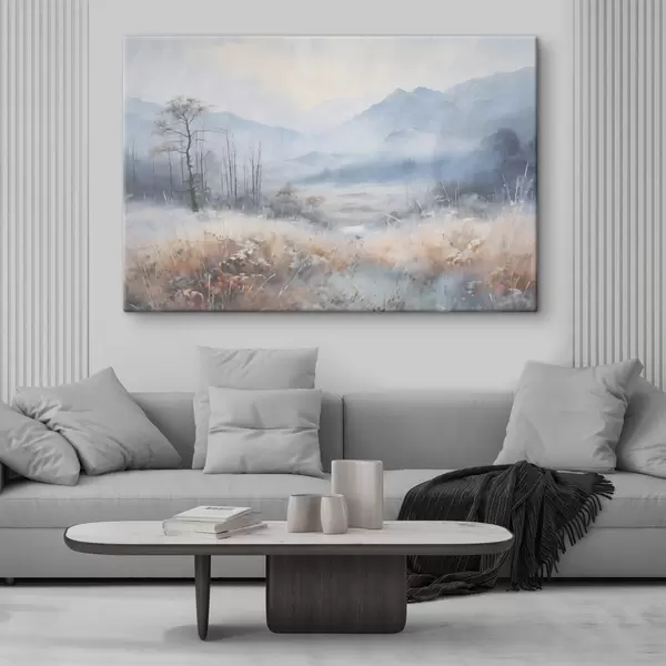 Pictură pe pânză Peisaj texturat cu munți, iarbă uscată și o pădure, culori stinse Nr s44402