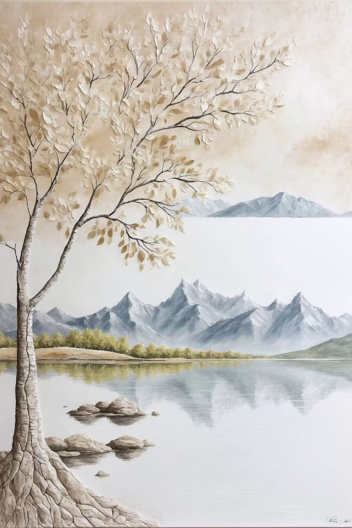 Tablouri Copac pe fundal lac și munți înzăpeziți s44459