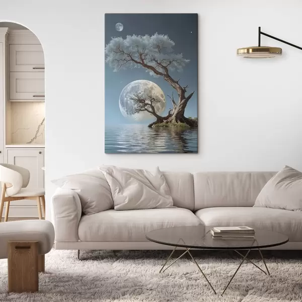 Pictură pe pânză Copac în creștere în mijlocul unui lac pe fundal luna Nr s44481