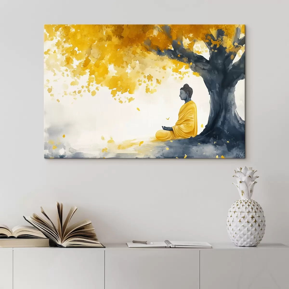 Tablouri Buddha meditând sub copac, culorile galben și gri s44509