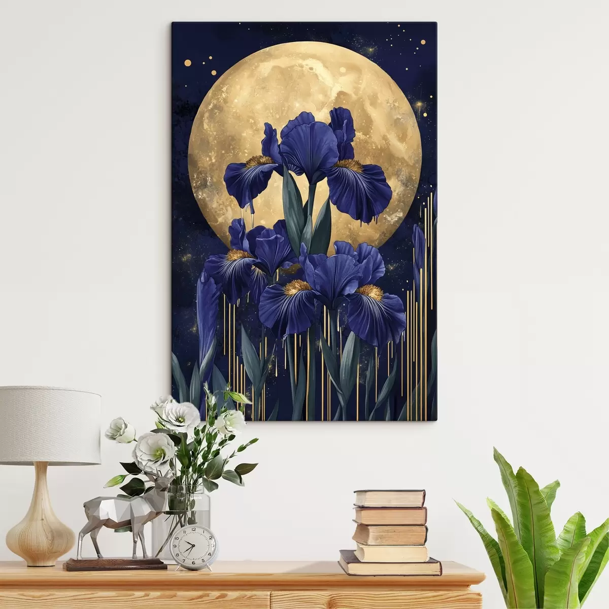 Tablouri Flori de iris, lună strălucitoare, cer de noapte, culori albastre s44510