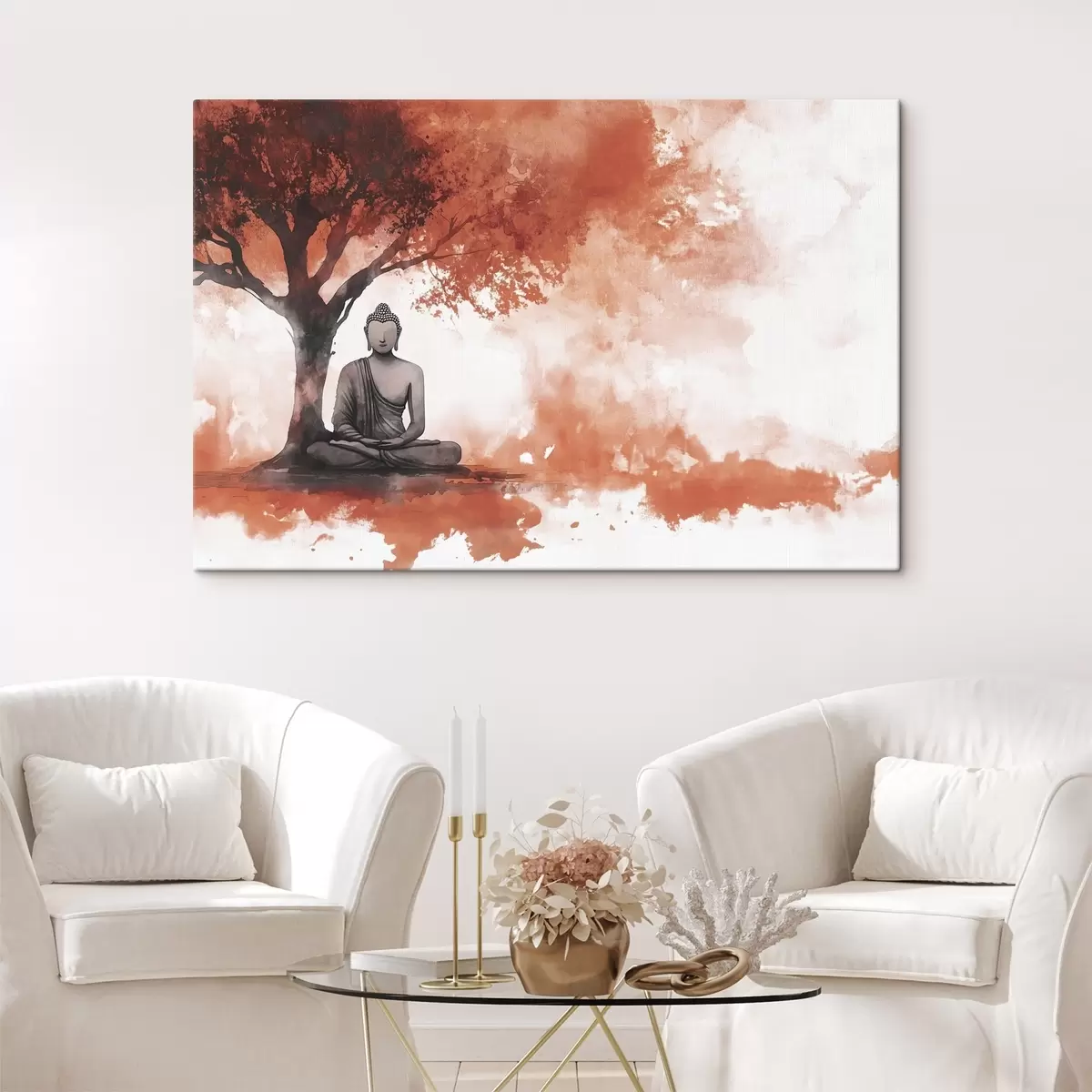Pictură pe pânză Buddha stând sub copac, meditație, spiritual, culori portocalii Nr s44512