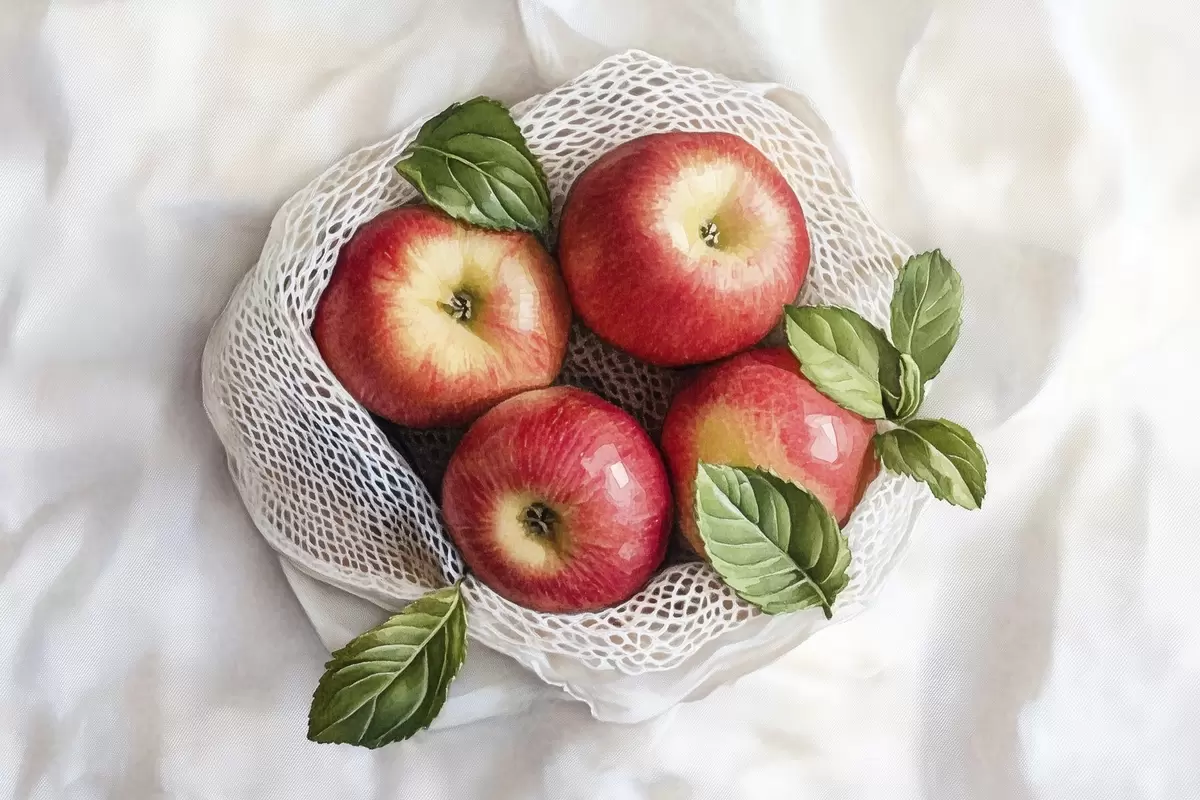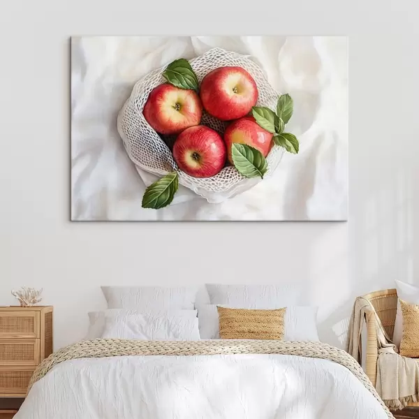 Tablouri Mere roșii în sac de in cu frunze de mentă, stil rustic, fructe s44609