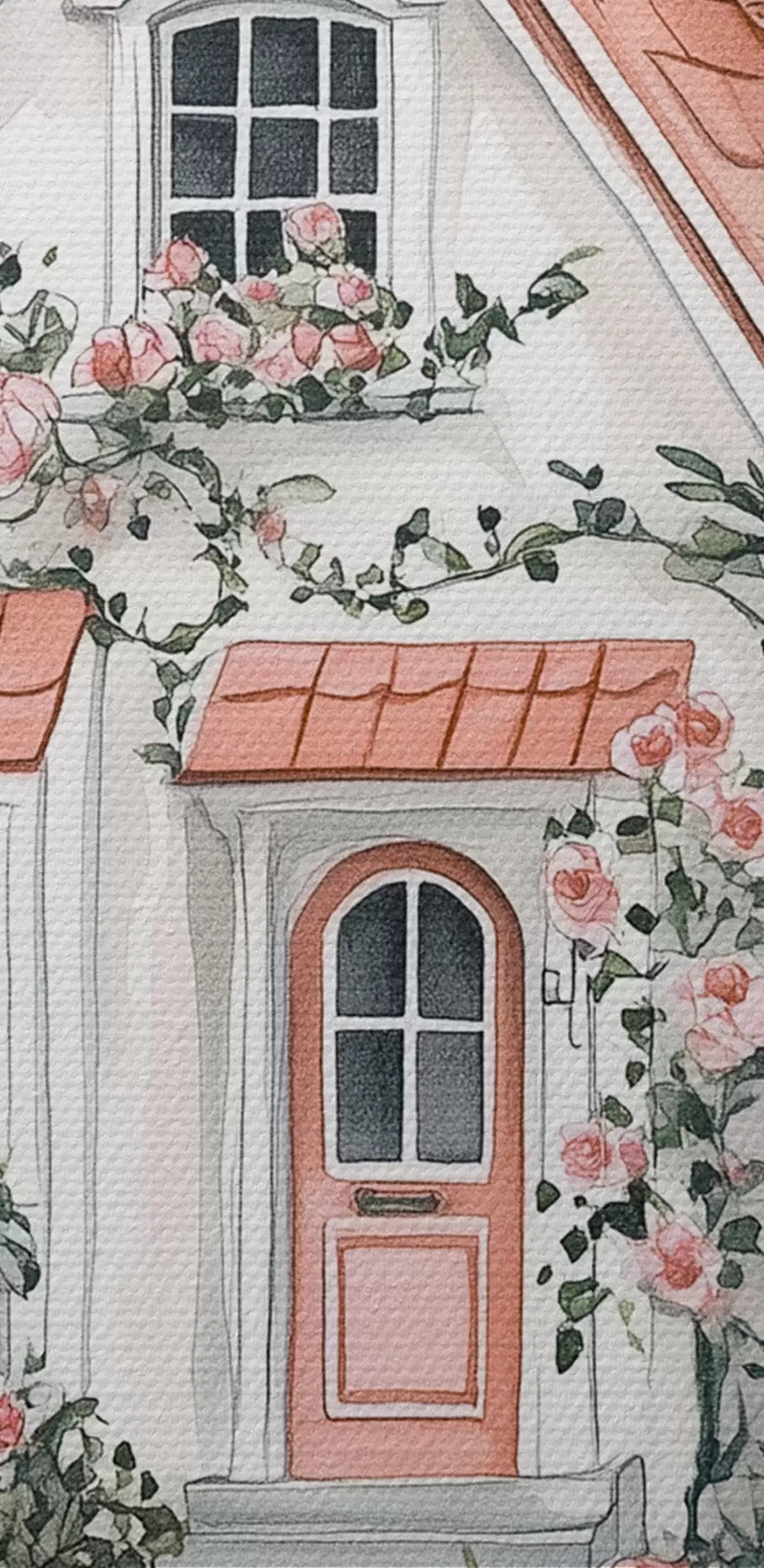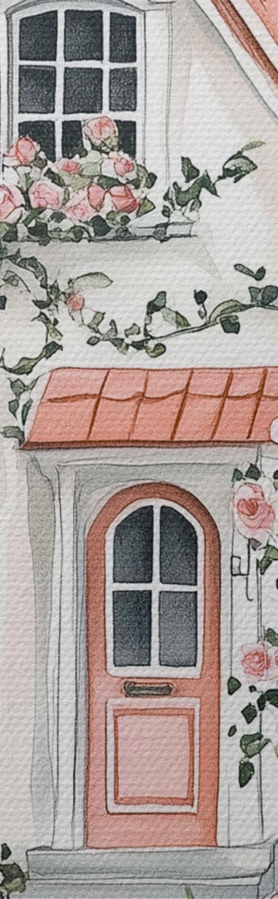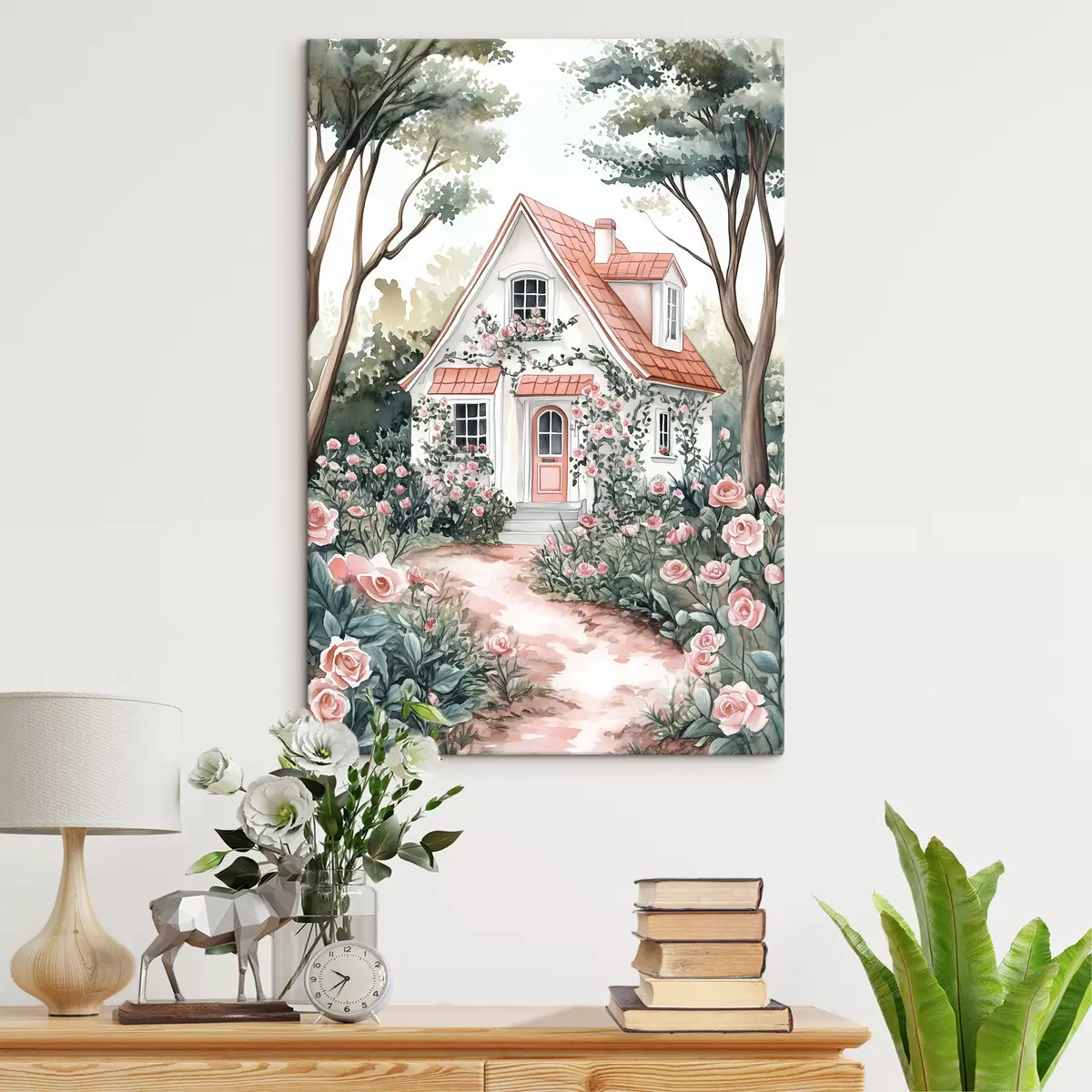 Pictură pe pânză Casă albă cu grădină de trandafiri în pădure Nr s44716