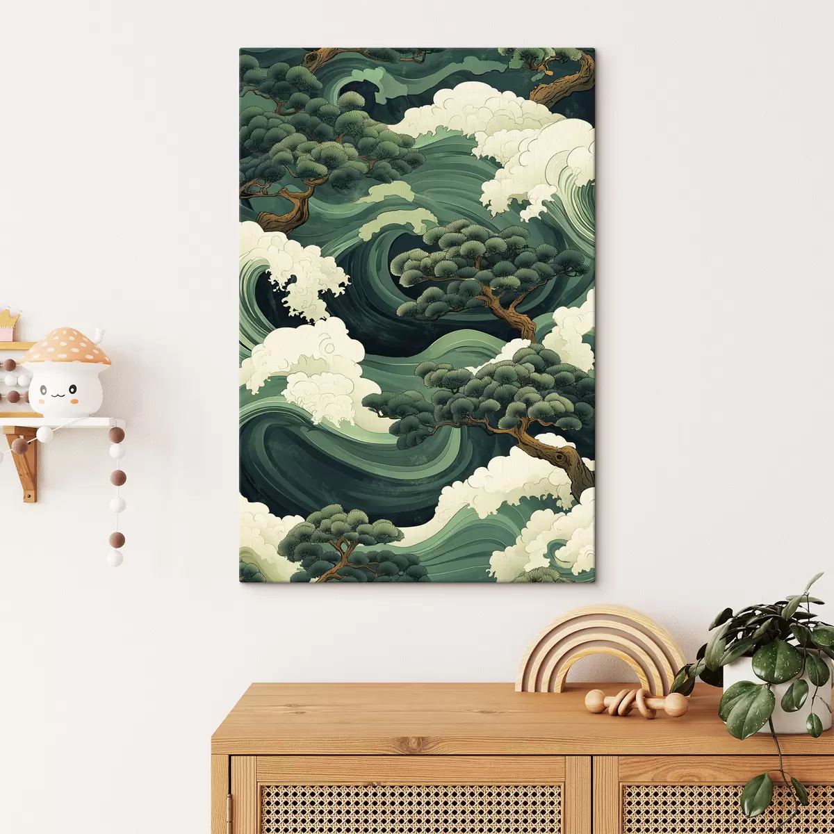 Pictură pe pânză Desen în stil chinezesc cu valuri de mare și pini Nr s44719