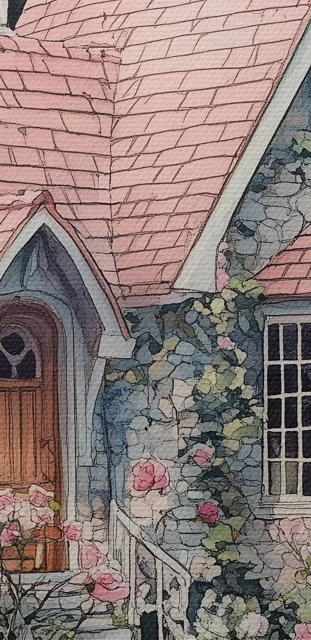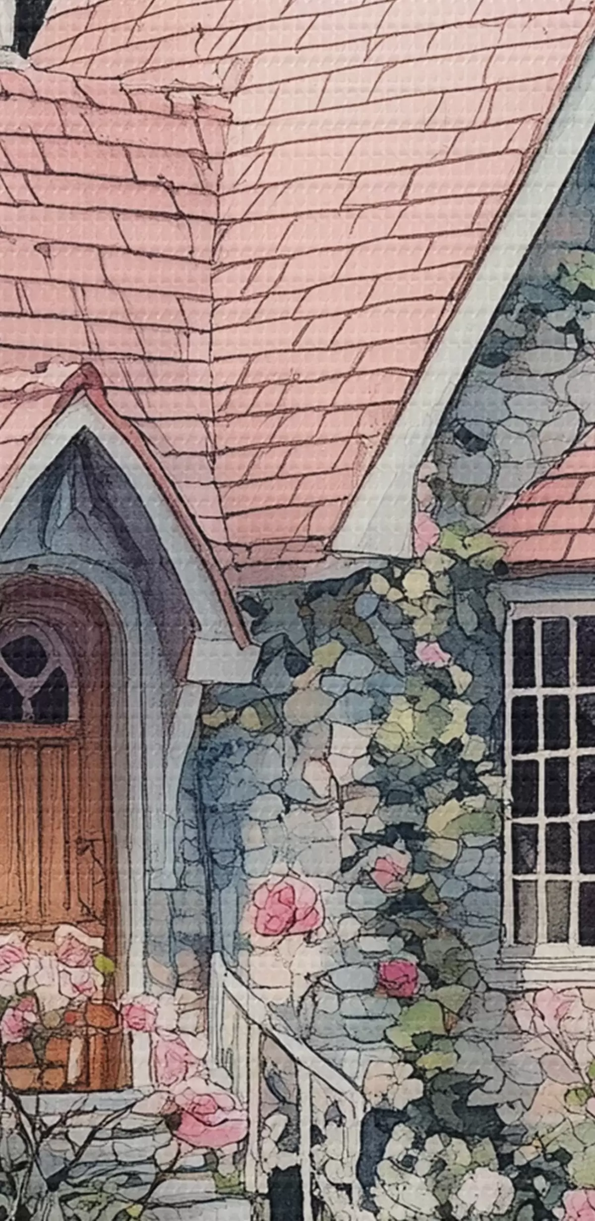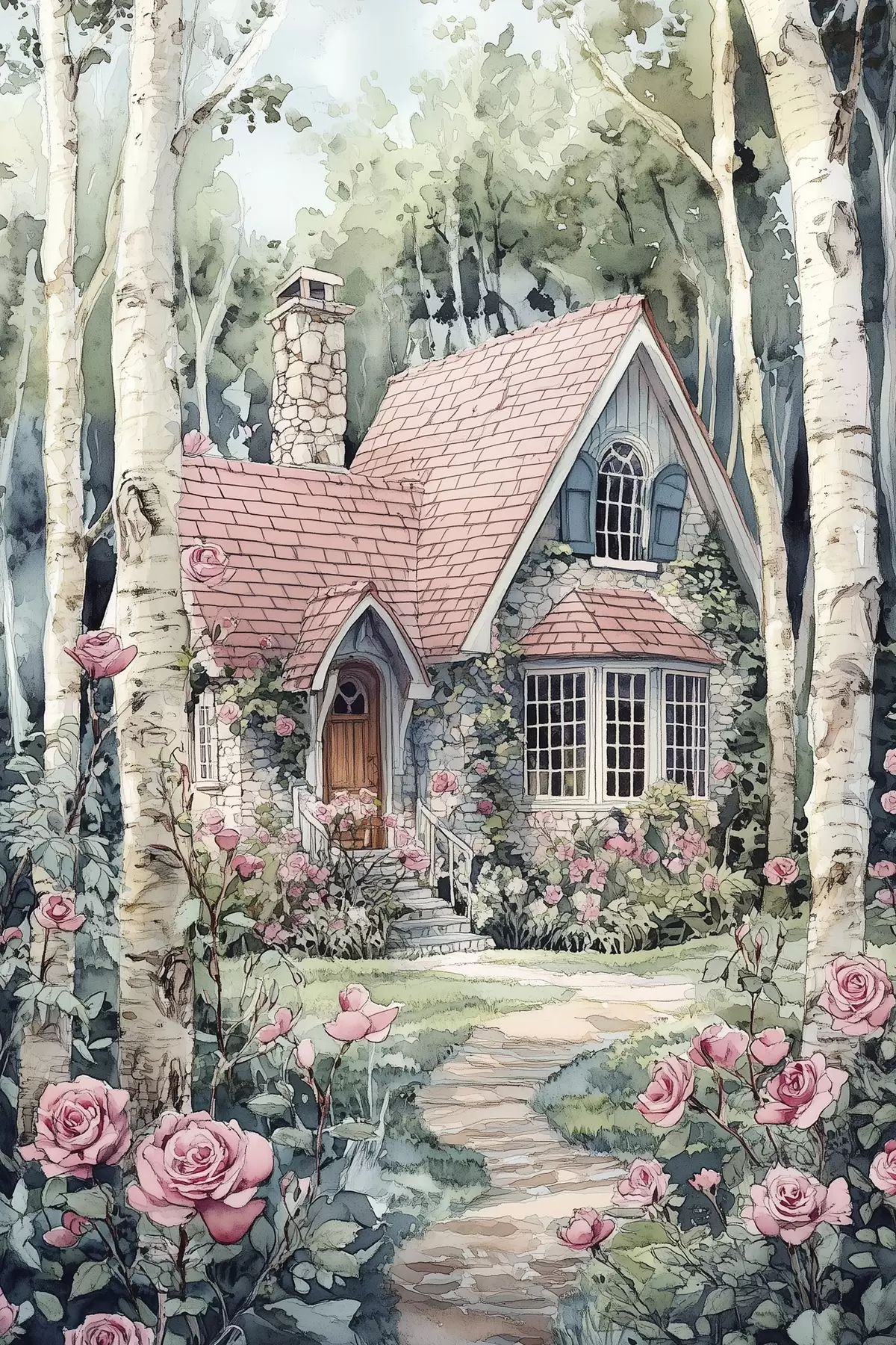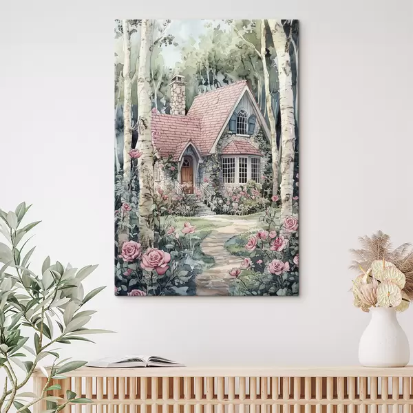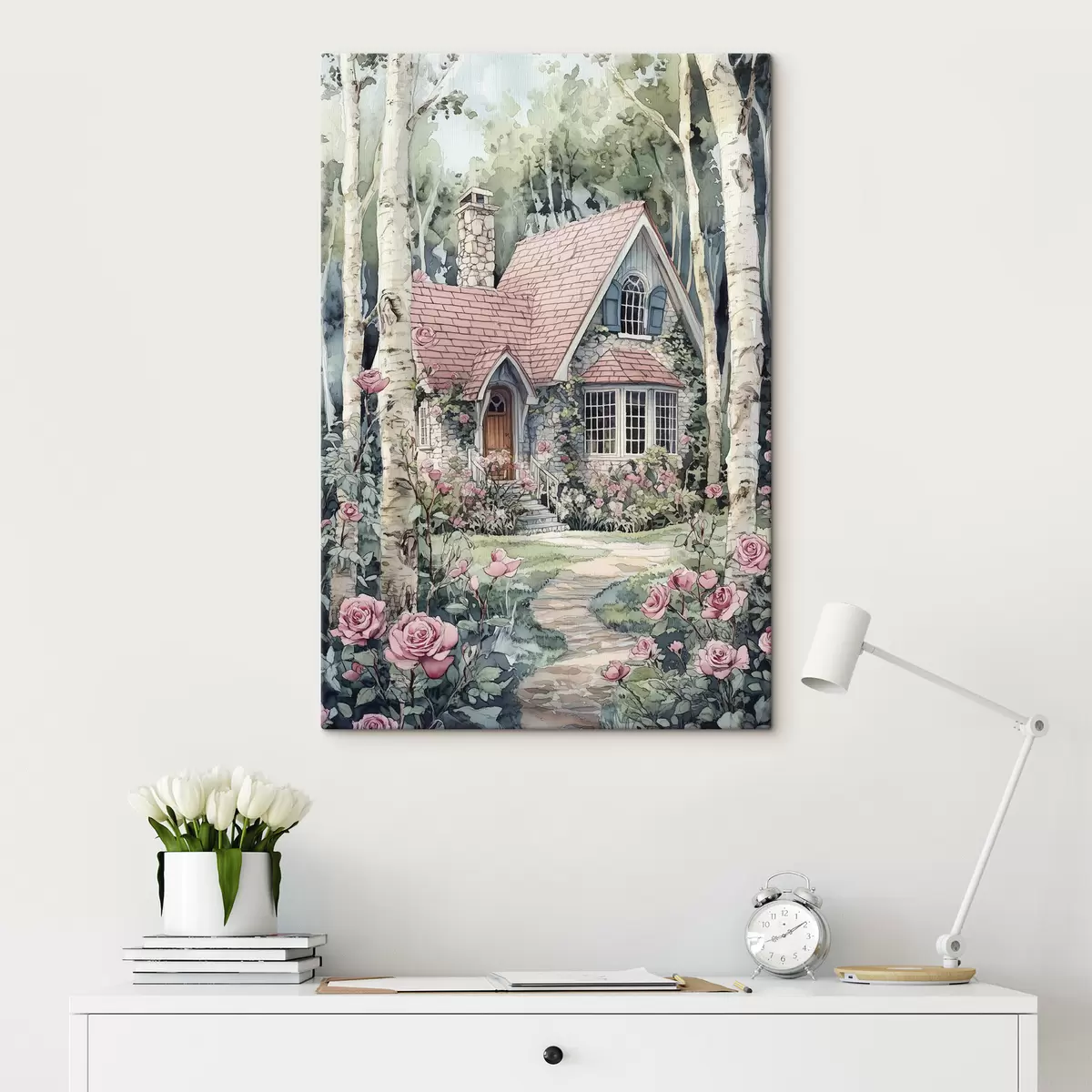 Pictură pe pânză Casă frumoasă în copaci de mesteacăn, grădină de trandafiri Nr s44721