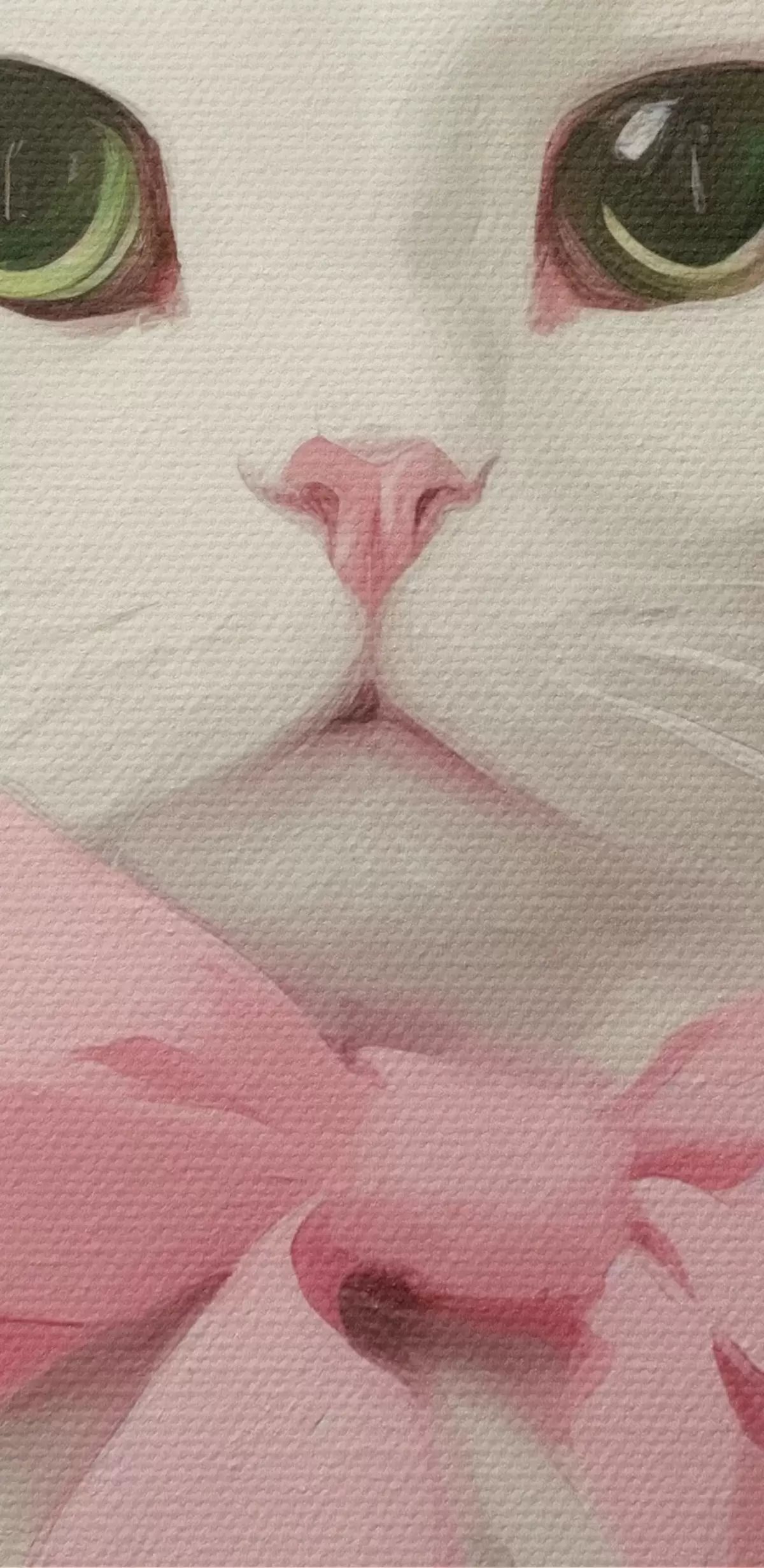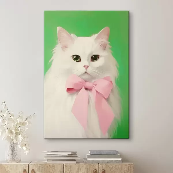 Pictură pe pânză Pisică albă cu arc roz Nr s44739