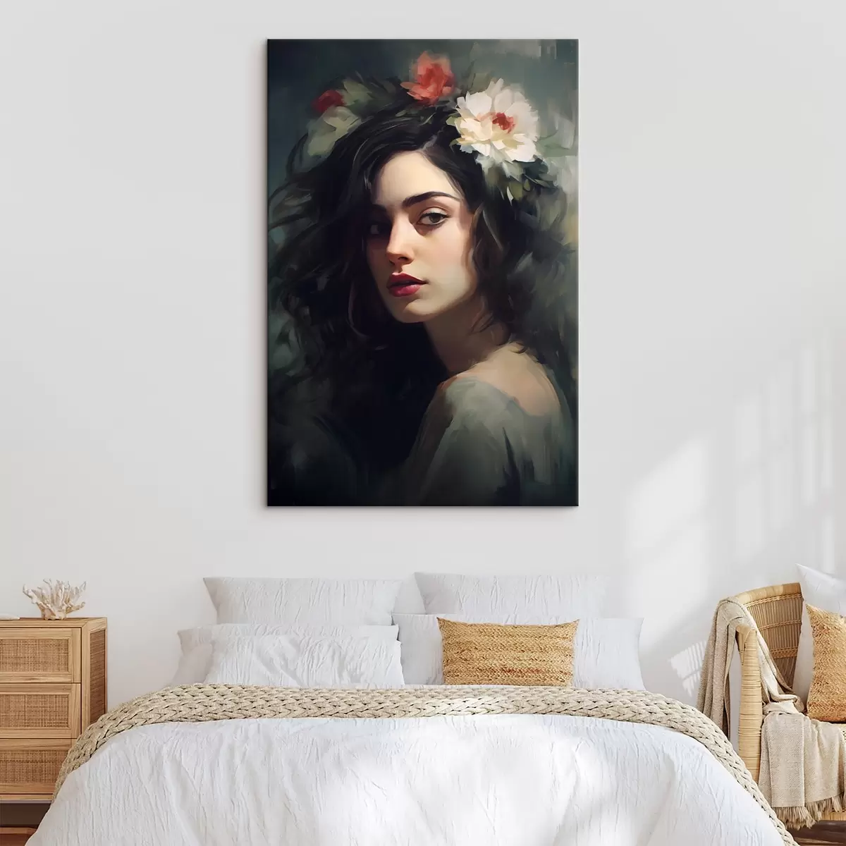 Pictură pe pânză Femeie cu părul negru cu o coroană de flori Nr s44762