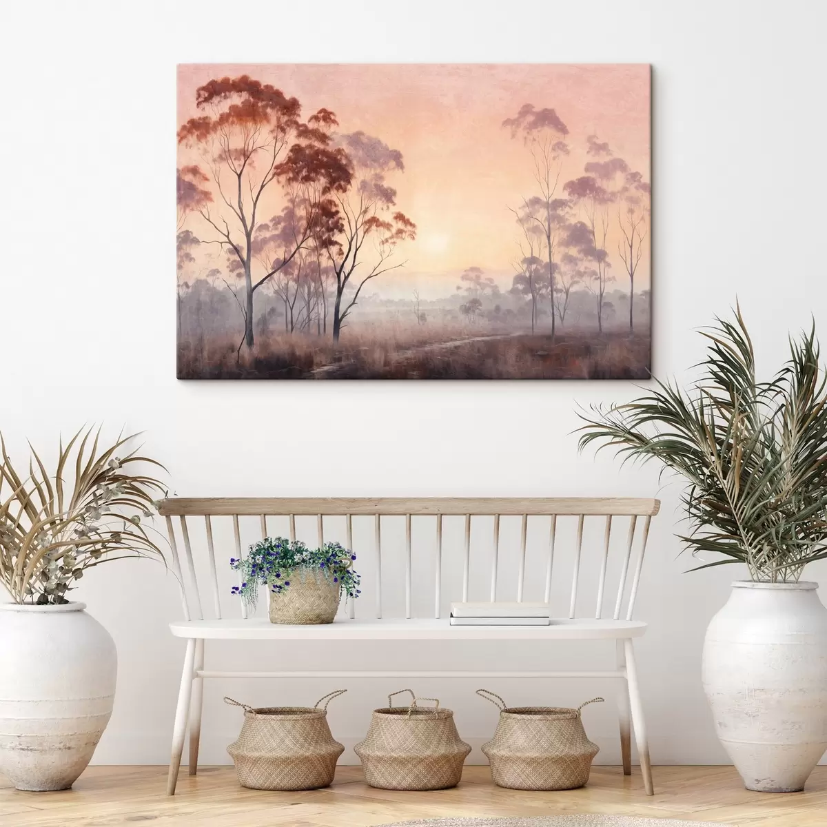 Pictură pe pânză O pictură peisagistică a unui câmp cu iarbă înaltă și copaci, soarele este în fundal Nr s44854