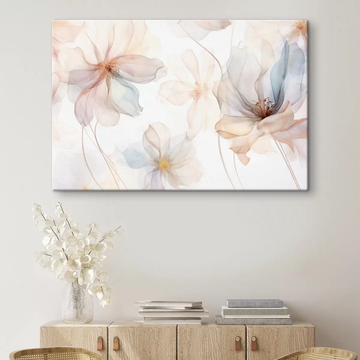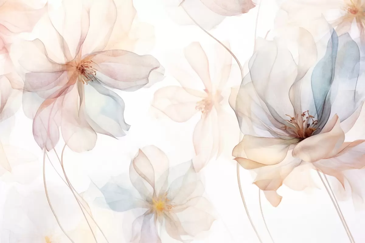 Pictură pe pânză Flori translucide texturate în culori pastelate, petale delicate, linii delicate pe un fundal alb Nr s44855