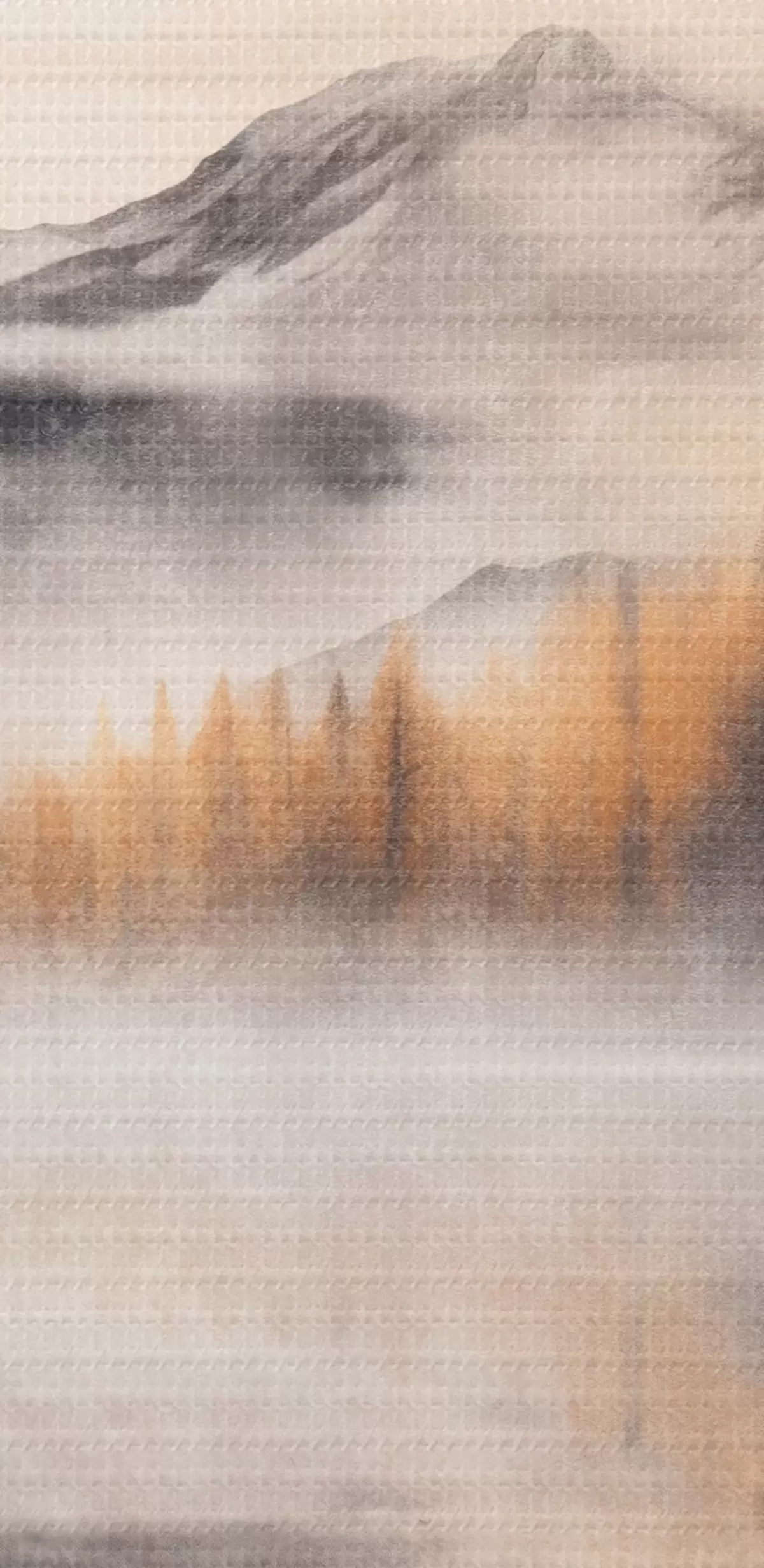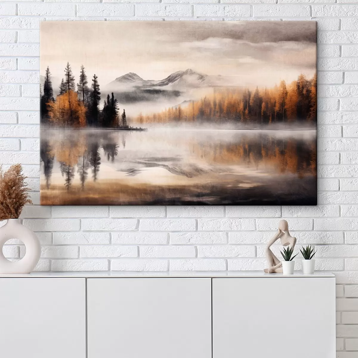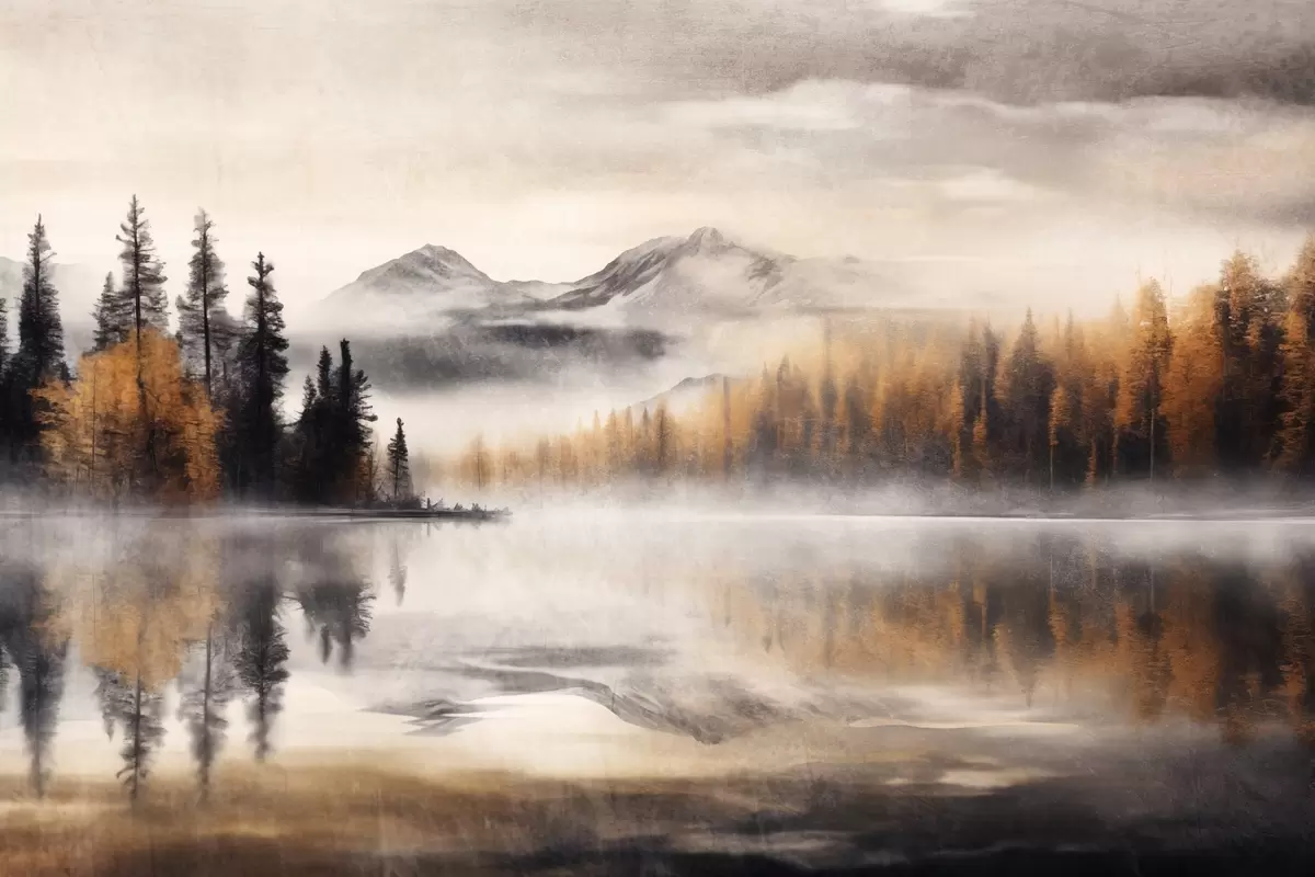 Pictură pe pânză Un peisaj de lac cețos texturat cu pini și munți, cer gri noros Nr s44856