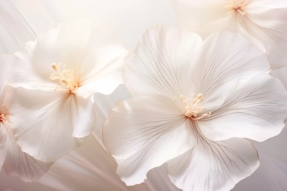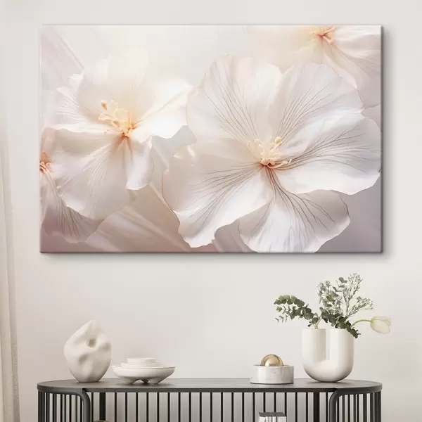 Pictură pe pânză Flori albe delicate cu petale și centre moi, în culori pastelate, creând o artă florală de vis și eterică Nr s44858