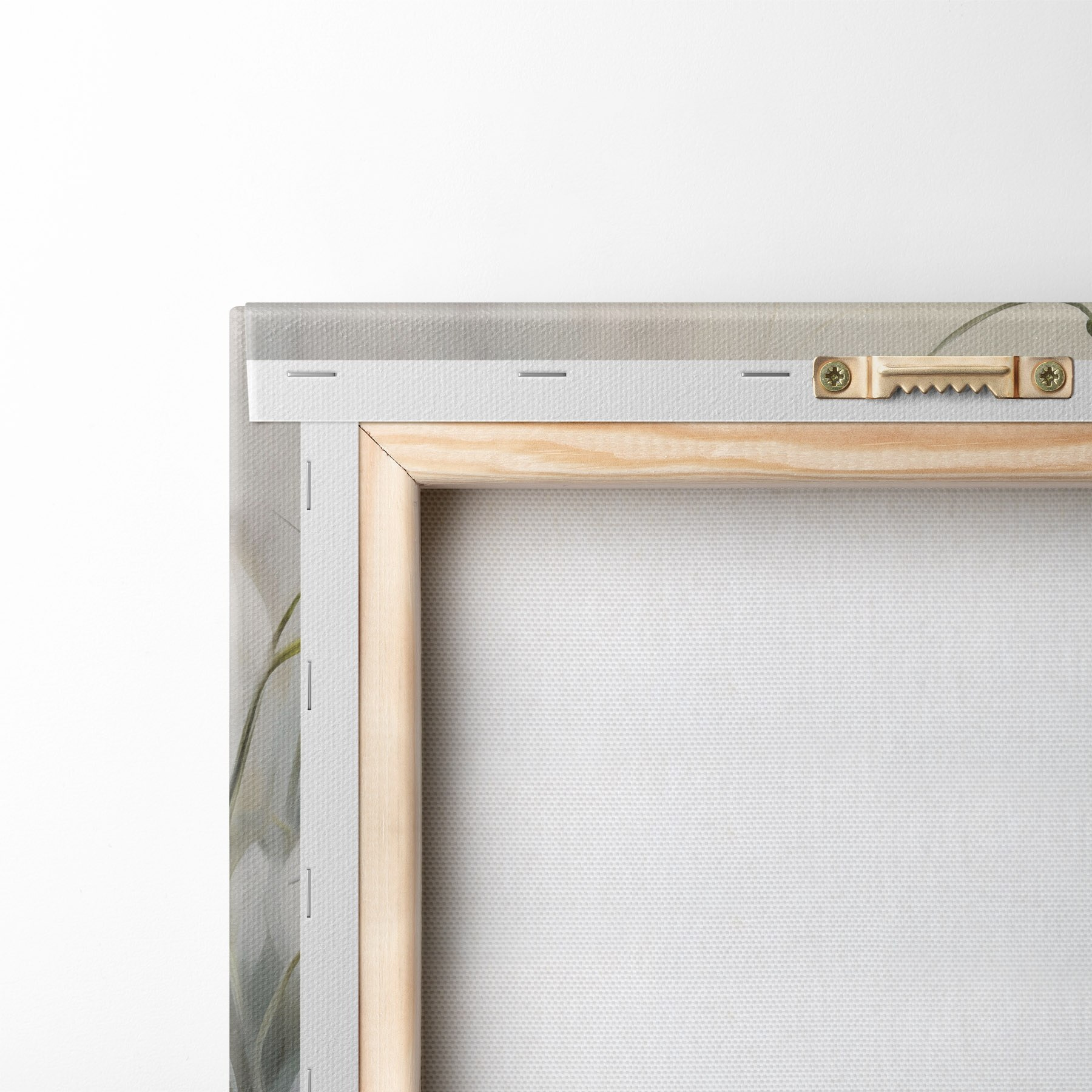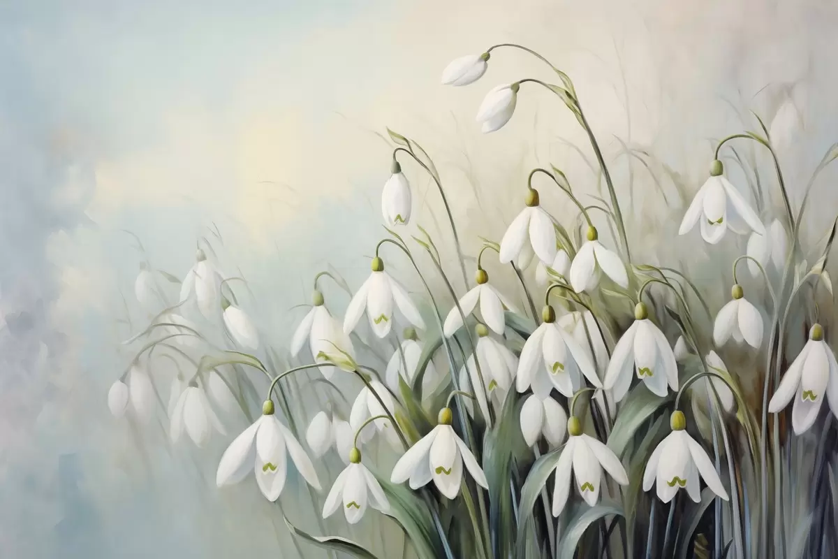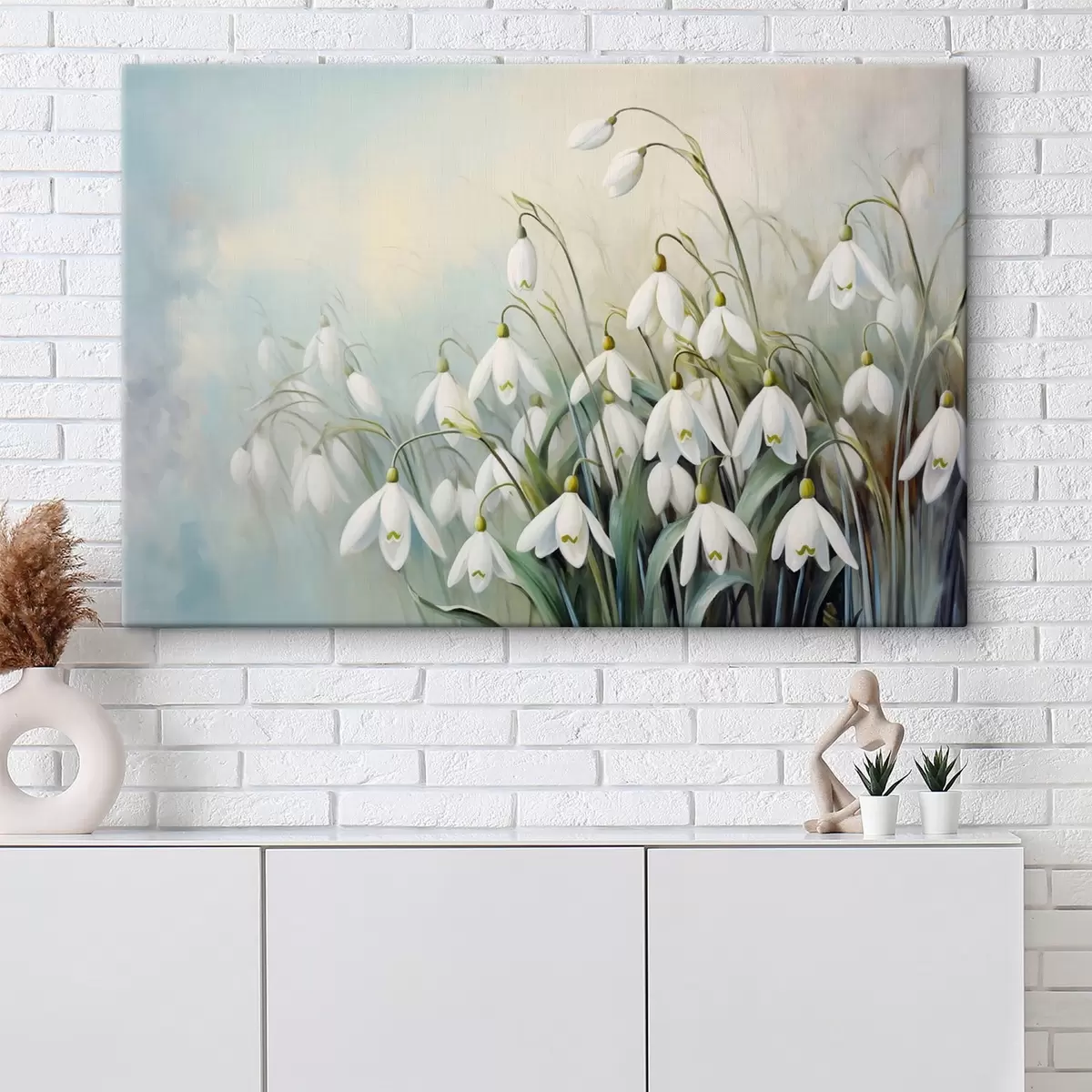 Pictură pe pânză Flori albe de ninsoare cu tulpini și frunze albastre și verzi, tușe moi, fundal neclar Nr s44864