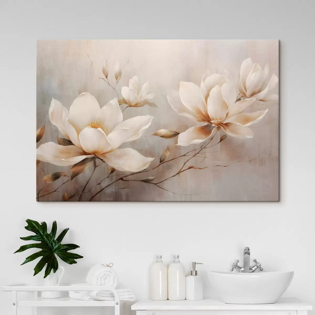 Pictură pe pânză Flori de magnolie albe de epocă texturate pe ramuri pe un fundal maro deschis Nr s44869