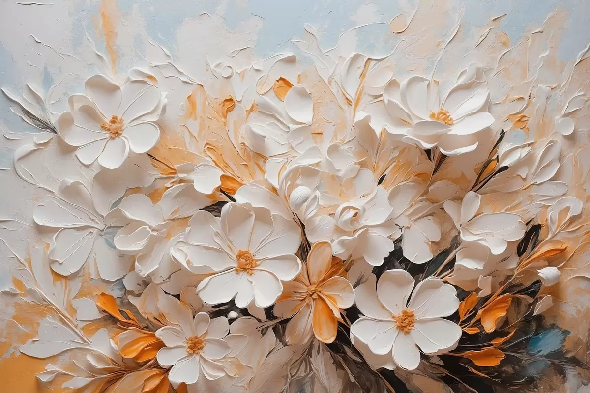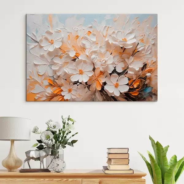 Pictură pe pânză Flori albe și piersici pe un fundal albastru cu pasteluri Nr s44879