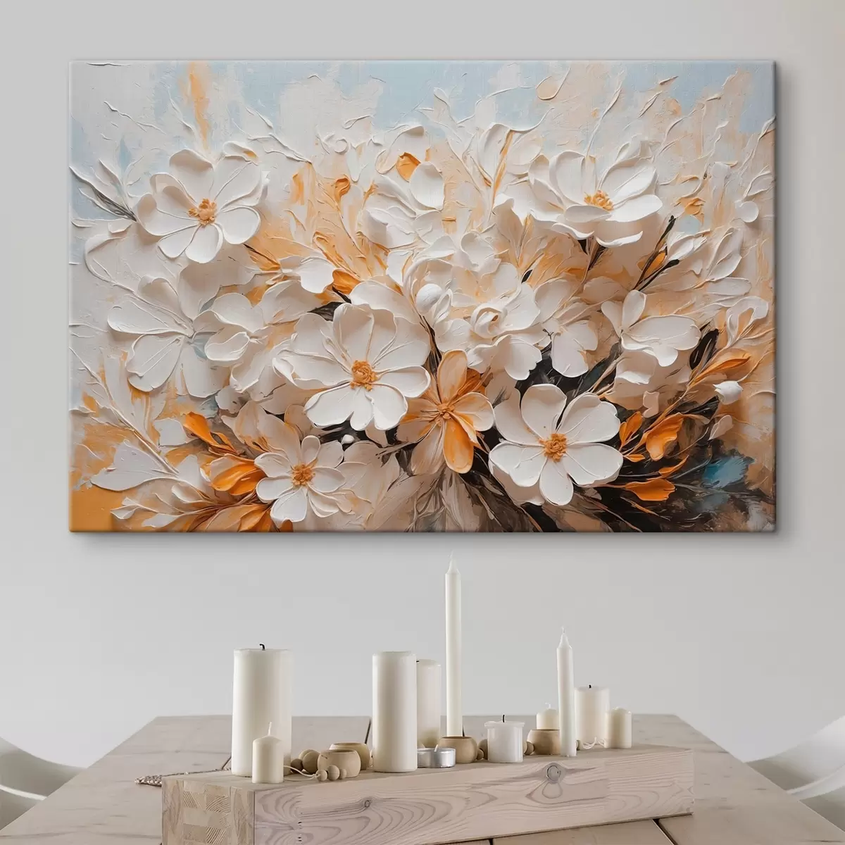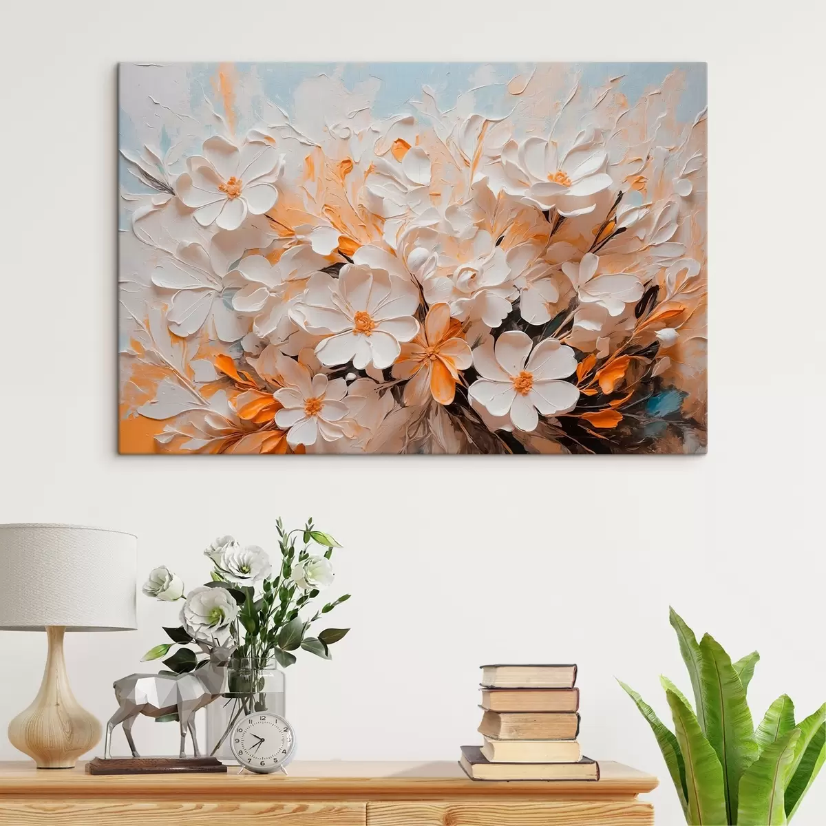 Tablouri Flori albe și piersici pe un fundal albastru cu pasteluri s44879