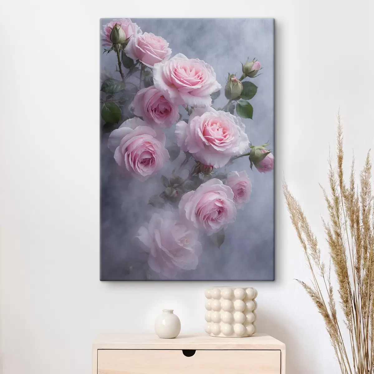 Pictură pe pânză Trandafiri roz moale în ceață cu frunze verzi Nr s44892