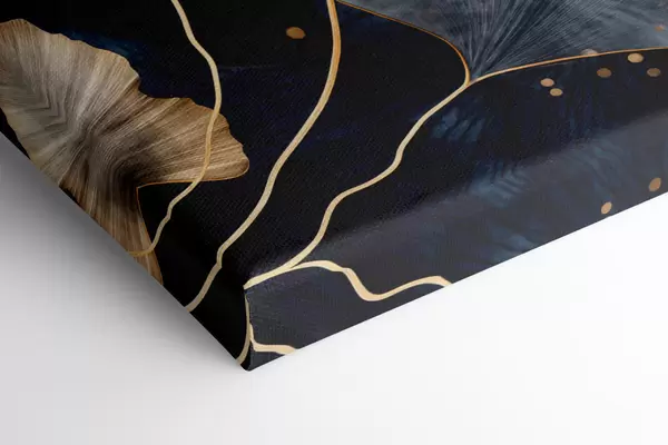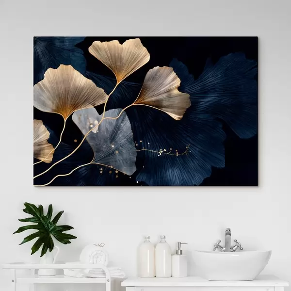 Tablouri Frunze Ginkgo în tonuri de galben și albastru, fundal întunecat elegant, artă modernă, stil minimalist, inspirat din natură s44921