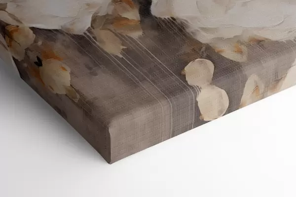 Pictură pe pânză Flori albe cu frunze maro pe un fundal bej, imitație pictură în ulei, aranjament floral, artă botanică Nr s44922