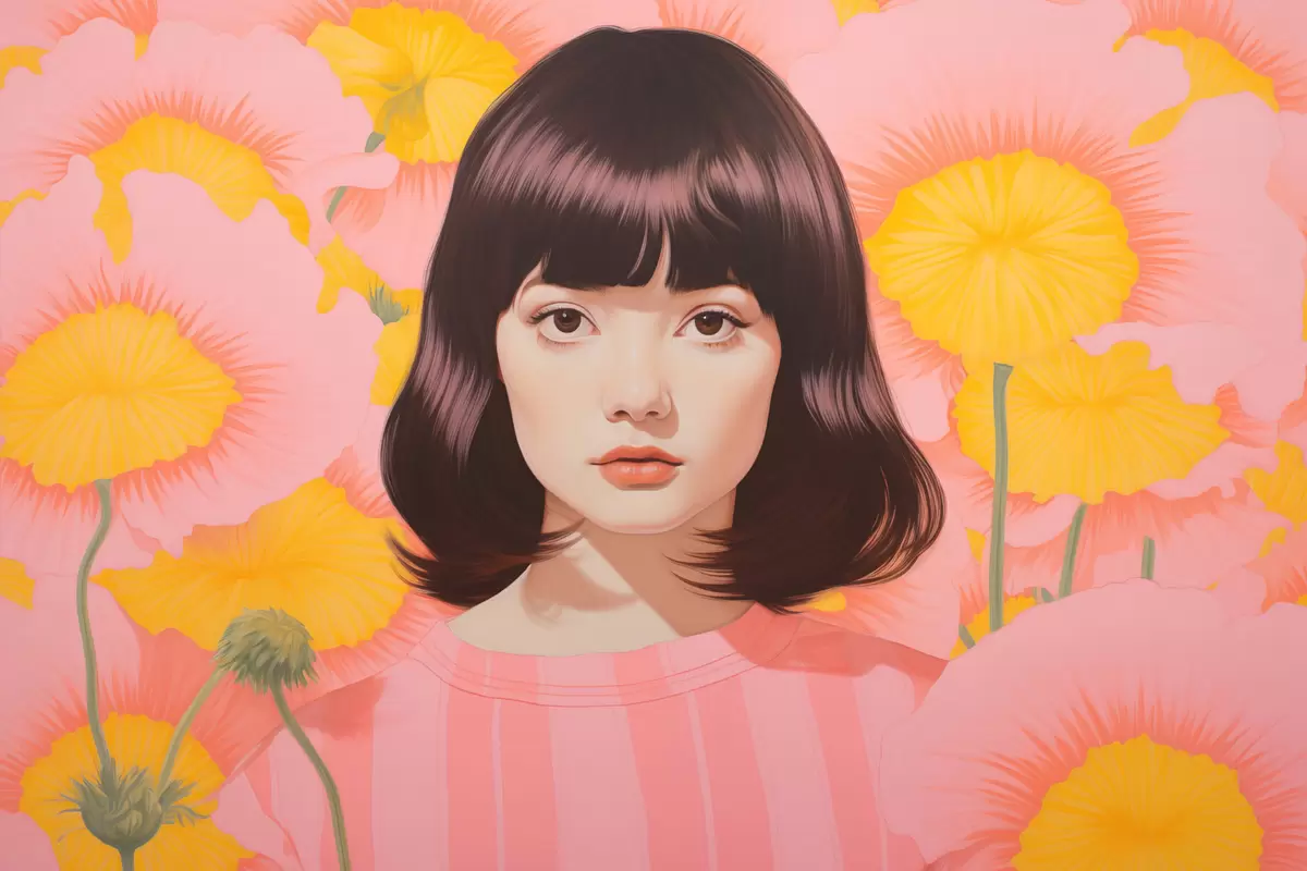 Tablouri Un portret minimalist decorativ al unei fete asiatice într-un câmp de flori galbene și roz s44924