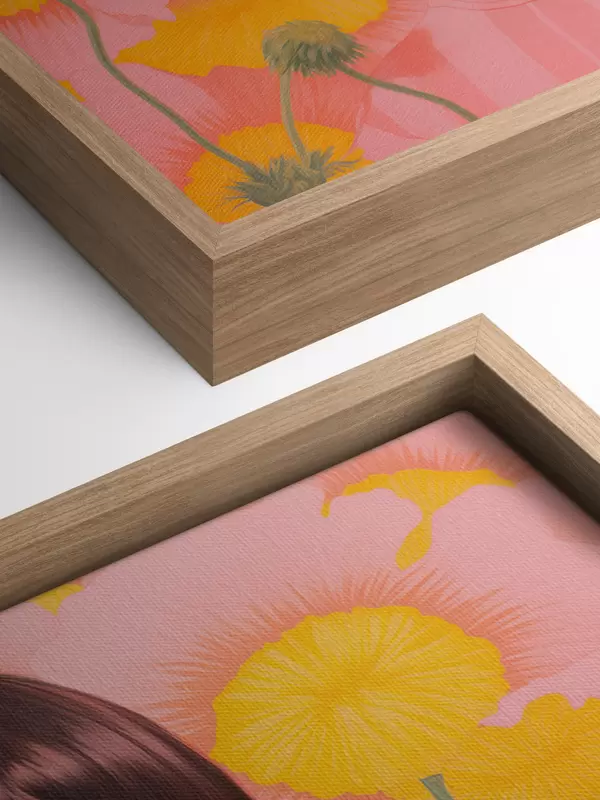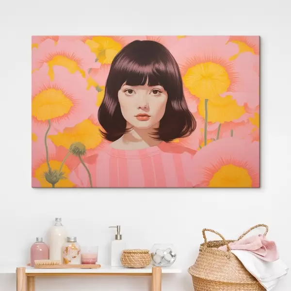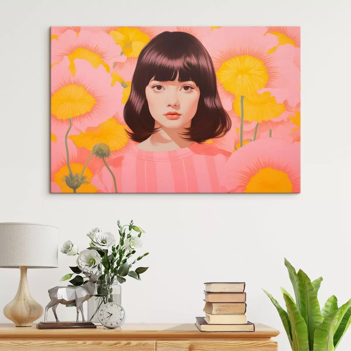 Pictură pe pânză Un portret minimalist decorativ al unei fete asiatice într-un câmp de flori galbene și roz Nr s44924